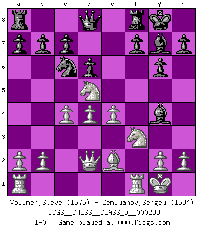 Last move : 1-0 2017 December 16 8:14:16 [Event "FICGS__CHESS__CLASS_D__000239"] [Site "FICGS"] [Date "2017.09.14"] [Round "1"] [White "Vollmer,Steve"] [Black "Zemlyanov,Sergey"] [Result "1-0"] [WhiteElo "1575"] [BlackElo "1584"] 1.d4 Nf6 2.Nf3 g6 3.c4 Bg7 4.Nc3 O-O 5.e4 d6 6.Be2 e5 7.O-O Nc6 8.Be3 Ng4 9.Nd5 Nxe3 10.fxe3 exd4 11.exd4 Bg4 12.Qd2 1-0 This chess game has been lost on time (started : 2017.09.14 13:55:27) King's Indian : East Indian defense Kingside Castling by player Black (move 4) Kingside Castling by player White (move 7) Player White won this chess game. Follow this game move after move (download)The game of chess is the touchstone of the intellect. (Goethe) Die Elozahlen sind sehr schlecht für das Schach. Jetzt ist Schach eine Sportindustrie, die darauf zielt Elopunkte zu machen. (Miguel Najdorf) En la perfecta combinación de Ajedrez como en una historia corta de primera clase, toda la trama y contra trama deberá conducir hacia un final sorprendente, el interes no es mitigado hasta el último momento. (Yates and Winter) L'attaque fait le spectacle, la défense gagne les matchs. (Dicton footballistique) Gambling is the son of avarice and the father of despair. (French proverb)