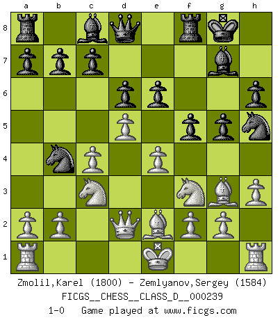 Last move : 1-0 2017 December 5 19:15:46 [Event "FICGS__CHESS__CLASS_D__000239"] [Site "FICGS"] [Date "2017.09.14"] [Round "1"] [White "Zmolil,Karel"] [Black "Zemlyanov,Sergey"] [Result "1-0"] [WhiteElo "1800"] [BlackElo "1584"] 1.d4 Nf6 2.c4 g6 3.Nc3 Bg7 4.Bg5 O-O 5.Nf3 d6 6.e4 h6 7.Bh4 g5 8.Bg3 Nh5 9.Be2 e6 10.Qd3 f5 11.h3 Nc6 12.d5 Nb4 13.Qd2 1-0 This chess game has been lost on time (started : 2017.09.14 13:55:27) King's Indian defense, 3.Nc3 Kingside Castling by player Black (move 4) Player White won this chess game. Follow this game move after move (download)Chess is really ninety nine percent calculation. (Soltis) Vom Schach wurde gesagt das Leben sei dafür nicht lange genug. Aber das ist der Fehler des Lebens, nicht des Schach'. (Irving Chernev) Botvinnik trataba de restarle el misterio al Ajedrez, siempre relacionandolo a situaciones de la vida ordinaria. El gustaba de llamar al Ajedrez un típico problema inexacto similar a aquellos de los cuales la gente siempre tiene que enfrentarse en la vida cotidiana. (Garry Kasparov) La solitude du joueur d'Echecs à l'approche du mat est semblable à celle du condamné. (Francis Szpiner) O divine art of subtlety and secrecy! Through you we learn to be invisible, through you inaudible and hence we can hold the enemy's fate in our hands. (Sun Tzu)