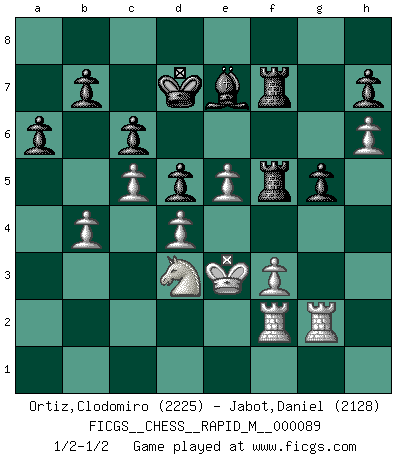 Last move : 1/2-1/2 2017 December 26 1:15:56 [Event "FICGS__CHESS__RAPID_M__000089"] [Site "FICGS"] [Date "2017.09.20"] [Round "1"] [White "Ortiz,Clodomiro"] [Black "Jabot,Daniel"] [Result "1/2-1/2"] [WhiteElo "2225"] [BlackElo "2128"] 1.Nf3 Nf6 2.d4 d5 3.c4 c6 4.g3 Bf5 5.Nc3 e6 6.Qb3 Qb6 7.c5 Qxb3 8.axb3 Na6 9.Ra4 Bc2 10.Bg2 Ne4 11.Ra5 Be7 12.O-O Bxb3 13.Nxe4 dxe4 14.Nd2 Bd5 15.Nxe4 f5 16.Ng5 Nc7 17.Bxd5 exd5 18.Nf3 Ne6 19.h4 O-O 20.Ra3 f4 21.gxf4 Nxf4 22.Bxf4 Rxf4 23.Rb3 Bf6 24.Kg2 Re4 25.e3 Re7 26.h5 Kf7 27.Ne5+ Ke6 28.Ng4 a6 29.Rh1 g6 30.Rd3 Bg7 31.R3d1 g5 32.h6 Bh8 33.Rd3 Kd7 34.Rh5 Rg8 35.Rd1 Re4 36.f3 R4e8 37.Kf2 Ref8 38.Ke2 Rf5 39.Rh3 Kc8 40.Nf2 Re8 41.b4 Kd7 42.e4 Bf6 43.e5 Be7 44.Nd3 Ref8 45.Rg3 Ke6 46.Rf1 Kd7 47.Rg2 R8f7 48.Ke3 Ke8 49.R1f2 Kd7 1/2-1/2 Reti Opening Kingside Castling by player White (move 12) Kingside Castling by player Black (move 19) This chess game ended in a draw. Follow this game move after move (download)In Chess, at least, the brave inherit the earth. (Edmar Mednis) Strategie ist, wie man ein Mädchen auf den Rücksitz bekommt. Taktik ist, was man tut, wenn man dann dort ist. (Anonymous) Una de estas pequeñas movidas modestas pudieran ser mas molestas a tu oponente que la amenaza mas grande. (Siegbert Tarrasch) Ce n'est pas pour s'amuser qu'il joue aux échecs : il célèbre un culte. (Vladimir Nabokov) The greatest con, that he ever pulled... was making you believe... that he is you. (Revolver, movie)