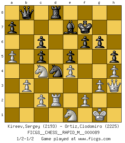 Last move : 1/2-1/2 2017 October 3 16:3:41 [Event "FICGS__CHESS__RAPID_M__000089"] [Site "FICGS"] [Date "2017.09.20"] [Round "1"] [White "Kireev,Sergey"] [Black "Ortiz,Clodomiro"] [Result "1/2-1/2"] [WhiteElo "2193"] [BlackElo "2225"] 1.e4 g6 2.d4 Bg7 3.Nc3 d6 4.Nf3 Nf6 5.Be2 O-O 6.O-O c6 7.a4 Nbd7 8.h3 Qc7 9.Be3 Re8 10.a5 e5 11.d5 Nc5 12.Bxc5 dxc5 13.dxc6 bxc6 14.Bc4 Rb8 15.b3 Nh5 16.Na4 Bf8 17.Qd2 Nf4 18.Nb2 Be6 19.Rfd1 Red8 20.Qe3 Bxc4 21.Nxc4 f6 22.Ne1 Rd4 23.Qf3 Qd7 24.h4 Rd8 25.Ne3 Be7 26.g3 Ne6 27.Qe2 Qb7 28.Nc4 Rxd1 29.Rxd1 Nd4 30.Qf1 Kg7 31.Kh1 Qb4 32.Rd3 Qb8 33.Rd2 h5 34.Qh3 Kf7 35.Kg1 Kg7 36.Kh1 Kf7 37.Kg1 1/2-1/2 Robatsch defense : Two knights variation Kingside Castling by player Black (move 5) Kingside Castling by player White (move 6) This chess game ended in a draw. Follow this game move after move (download)Up to this point White has been following well-known analysis. But now he makes a fatal error: he begins to use his own head. (Siegbert Tarrasch) Frage des Reporters: -Worin besteht das Ziel von Gambiteröffnungen? Antwort: -Auf Kosten der Partie einen Ruf als Angriffspieler zu erwerben.- (Siegbert Tarrasch) Después de la respuesta de las negras a 1.e4 con 1..e5, se quedan siempre tratando de entrar dentro del juego. (Howard Staunton) Votre prénom est 'Tactique', votre deuxième prénom est 'Tactique' et votre nom est 'Tactique'. (Ken Smith) I'm extremely disappointed. I send you out for exciting, new designer drugs, you come back with tomato sauce. (Gregory House, House M.D.)