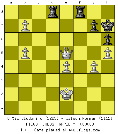 Last move : 1-0 2017 October 12 18:12:38 [Event "FICGS__CHESS__RAPID_M__000089"] [Site "FICGS"] [Date "2017.09.20"] [Round "1"] [White "Ortiz,Clodomiro"] [Black "Wilson,Norman"] [Result "1-0"] [WhiteElo "2225"] [BlackElo "2112"] 1.d4 Nf6 2.c4 e6 3.Nf3 b6 4.g3 Ba6 5.Qa4 c5 6.Bg2 Bb7 7.dxc5 Bxc5 8.O-O O-O 9.Nc3 Be7 10.Rd1 Na6 11.Bf4 Nc5 12.Qc2 Nce4 13.Ne5 Nxc3 14.Bxb7 Nxd1 15.Rxd1 Rb8 16.Nc6 dxc6 17.Rxd8 Rbxd8 18.Bxc6 Bd6 19.Bd2 Rc8 20.Bb5 a5 21.a3 Rfd8 22.b4 axb4 23.axb4 Be7 24.Kg2 Bf8 25.h3 Be7 26.Bc3 Bf8 27.e3 Ne8 28.Bd4 Rb8 29.Bxe8 Rxe8 30.Qa4 Red8 31.f4 Bd6 32.Kf3 h6 33.g4 Be7 34.Qb5 Bd6 35.h4 Rf8 36.Bxb6 Rfc8 37.c5 Bc7 38.Qd7 Bxb6 39.cxb6 Rd8 40.Qc7 Rdc8 41.b5 Rf8 42.b7 f6 43.h5 Kh7 44.Ke2 Rbd8 45.e4 e5 46.fxe5 fxe5 47.Qxe5 1-0 Queen's Indian : Nimzovich variation (exaggerated Fianchetto) Kingside Castling by player White (move 8) Kingside Castling by player Black (move 8) Player White won this chess game. Follow this game move after move (download)Chess, like love, is infectious at any age. (Flohr) Nie in meinem Leben habe ich die französische Verteidigung gespielt, welche die Stumpfsinnigste von allen ist. (Wilhelm Steinitz) Cualquier cambio de material en una posición debe venir por medio de un mate, una captura o promoción de Peón. (Purdy) Je menace de comprendre la position. (Anonyme) A person who never made a mistake never tried anything new. (Albert Einstein)