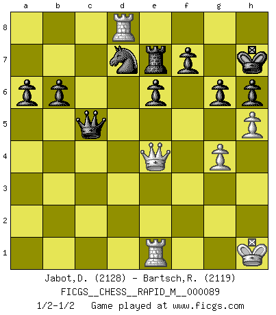 Last move : 1/2-1/2 2017 November 28 22:51:29 [Event "FICGS__CHESS__RAPID_M__000089"] [Site "FICGS"] [Date "2017.09.20"] [Round "1"] [White "Jabot,Daniel"] [Black "Bartsch,Reinhard Andrea"] [Result "1/2-1/2"] [WhiteElo "2128"] [BlackElo "2119"] 1.e4 c5 2.Nf3 d6 3.d4 cxd4 4.Nxd4 Nf6 5.Nc3 a6 6.Bg5 e6 7.f4 Qb6 8.Qd2 Qxb2 9.Rb1 Qa3 10.e5 dxe5 11.fxe5 h6 12.Bh4 Nfd7 13.Ne4 Qxa2 14.Rd1 Qd5 15.Qe3 Qxe5 16.Be2 Bc5 17.Bg3 Qd5 18.c4 Bxd4 19.Rxd4 Qa5+ 20.Rd2 O-O 21.Bd6 Rd8 22.g4 b6 23.O-O Bb7 24.Rfd1 Nf8 25.Bf3 Bxe4 26.Bxe4 Ra7 27.Bxf8 Rxf8 28.Rd8 Re7 29.Bh7+ Kxh7 30.Rxf8 Nd7 31.Qe4+ g6 32.Rd8 Ne5 33.Kh1 Qc5 34.h4 Nxc4 35.h5 Ne5 36.Re1 Nd7 1/2-1/2 Sicilian : Najdorf, 7...Qb6 Kingside Castling by player Black (move 20) Kingside Castling by player White (move 23) This chess game ended in a draw. Follow this game move after move (download)I prefer to lose a really good game than to win a bad one. (David Levy) Moralische Siege zählen nicht. (Savielly Grigorievitsch Tartakower) Del Ajedrez se ha dicho que la vida no es lo suficientemente larga para él, pero eso es culpa de la vida, no del Ajedrez. (William Ewart Napier) RxDa4 pat (...) The man who strikes first admits that his ideas have given out. (Chinese proverb)