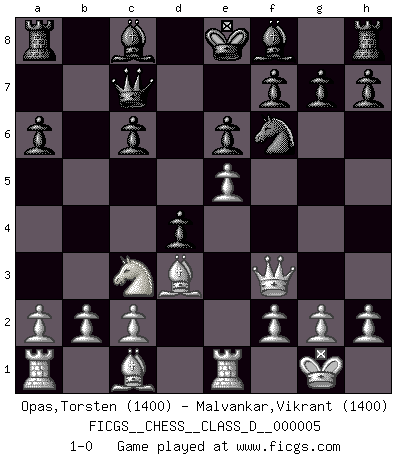 Last move : 1-0 2006 September 15 1:0:24 [Event "FICGS__CHESS__CLASS_D__000005"] [Site "FICGS"] [Date "2006.06.01"] [Round "1"] [White "Opas,Torsten"] [Black "Malvankar,Vikrant"] [Result "1-0"] [WhiteElo "1400"] [BlackElo "1400"] 1.e4 c5 2.Nc3 Nc6 3.Nf3 d6 4.d4 cxd4 5.Nxd4 Nf6 6.Bc4 e6 7.O-O a6 8.Nxc6 bxc6 9.Qf3 d5 10.Bd3 Qc7 11.Re1 d4 12.e5 1-0 Sicilian : Closed, 2...Nc6 Kingside Castling by player White (move 7) Player White won this chess game. Follow this game move after move (download)Robert Fischer is a law unto himself. (Larry Evans) Im Spitzenschach von heute geht es nur um Vorbereitung, um tiefgründige, sorgfältige Eröffnungsvorbereitung. (Nigel Short) Buenas posiciones no logran ganar juegos, buenas movidas sí. (Gerald Abrahams) La victoire dans une partie d'Echecs appartient la plupart du temps à celui qui voit un peu plus loin que l'adversaire. (Lasker) Now be brave and don't look back. Don't look back. (Shmi Skywalker in Star Wars ep.1)