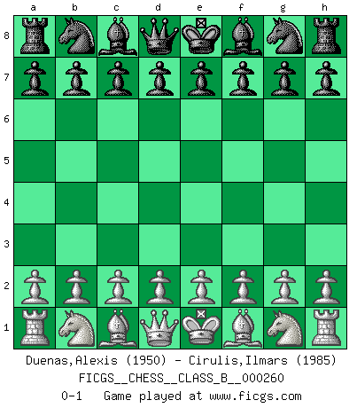 Last move : 0-1 2017 November 3 12:30:50 [Event "FICGS__CHESS__CLASS_B__000260"] [Site "FICGS"] [Date "2017.09.24"] [Round "1"] [White "Duenas,Alexis"] [Black "Cirulis,Ilmars"] [Result "0-1"] [WhiteElo "1950"] [BlackElo "1985"] 0-1 This chess game has been lost on time (started : 2017.09.24 10:7:49) Player Black won this chess game. Follow this game move after move (download)My opponents make good moves too. Sometimes I don't take these things into consideration. (Bobby Fischer) Verschiedene, sehr schätzbare und im Laufe des Lebens nützliche Eigenschaften des Geistes können durch das Schachspiel erworben und gekräftigt werden, so dass sie zu Gewohnheiten werden, die uns nie im Stich lassen. (Benjamin Franklin) Cuando le juegas a Fischer, no es una cuestion de si vas a ganar o perder. Es una cuestion de si vas a sobrevivir. (Boris Spassky) Avec des compensations pour le matériel en plus... (Anonyme) A belief is an idea the mind possesses, an idea that possesses the mind. (Robert Oxden Bolton)