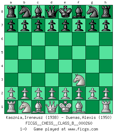 Last move : 1-0 2017 November 3 12:30:50 [Event "FICGS__CHESS__CLASS_B__000260"] [Site "FICGS"] [Date "2017.09.24"] [Round "1"] [White "Kasznia,Ireneusz"] [Black "Duenas,Alexis"] [Result "1-0"] [WhiteElo "1938"] [BlackElo "1950"] 1.Nf3 1-0 This chess game has been lost on time (started : 2017.09.24 10:7:49) Reti Opening Player White won this chess game. Follow this game move after move (download)A passed Pawn increases in strength as the number of pieces on the board diminishes. (Capablanca) Ich bin stolz ein Bulgare zu sein. (Veselin Topalov) Uno no tiene que jugar muy bien, es suficiente jugar mejor que el oponente. (Siegbert Tarrasch) Roi des jeux et jeu des rois, les échecs portent en eux un sentiment d'infini. Ils donnent à celui qui s'est efforcé d'en approfondir les arcanes l'impression de n'être pas à la mesure de l'homme; en fait, ils constituent un résumé de l'univers, un microcosme, et figurent cette grande échelle qui, dans les plans de la lumière descend jusqu'à la matière, qui des abîmes insondables remonte jusqu'en l'infini de Dieu. (Pyrame) It's not a bug - it's an undocumented feature. (Anonymous)