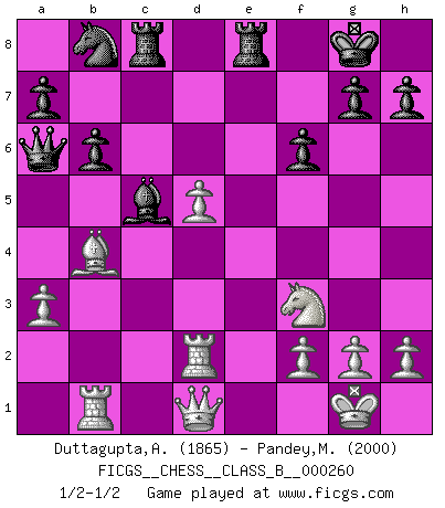 Last move : 1/2-1/2 2018 February 26 13:5:23 [Event "FICGS__CHESS__CLASS_B__000260"] [Site "FICGS"] [Date "2017.09.24"] [Round "1"] [White "Duttagupta,Aniruddha"] [Black "Pandey,Manoj"] [Result "1/2-1/2"] [WhiteElo "1865"] [BlackElo "2000"] 1.c4 b6 2.d4 Bb7 3.Nc3 e6 4.a3 Nf6 5.Nf3 d5 6.cxd5 Nxd5 7.Qc2 Nxc3 8.bxc3 Be7 9.e4 O-O 10.Bd3 c5 11.O-O Qc8 12.Qe2 Ba6 13.Rd1 Bxd3 14.Rxd3 cxd4 15.cxd4 Rd8 16.Ng5 f6 17.Nf3 Nc6 18.Bd2 Qa6 19.Bc3 Re8 20.Qd1 Rad8 21.Rd2 Rc8 22.d5 exd5 23.exd5 Nb8 24.Bb4 Bc5 25.Rb1 1/2-1/2 English Opening Kingside Castling by player Black (move 9) Kingside Castling by player White (move 11) This chess game ended in a draw. Follow this game move after move (download)It began to feel as though you were playing against Chess itself. - On playing against Robert Fischer. (Walter Shipman) Nach Morphy wurde nichts neues mehr in der Behandlung offener Positionen gefunden. (Mikhail Moiseyevich Botvinik) Aún el Rey más flojo huye despavorido ante la amenaza de un Jaque doble. (Aaron Nimzowitsch) Le moment que je préfère le plus dans une rencontre, c'est celui où je sens que la personnalité de l'adversaire se brise. (Robert Fischer) Empty your mind, be formless, shapeless — like water. (Bruce Lee)