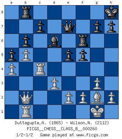 Last move : 1/2-1/2 2017 October 12 15:23:16 [Event "FICGS__CHESS__CLASS_B__000260"] [Site "FICGS"] [Date "2017.09.24"] [Round "1"] [White "Duttagupta,Aniruddha"] [Black "Wilson,Norman"] [Result "1/2-1/2"] [WhiteElo "1865"] [BlackElo "2112"] 1.c4 Nf6 2.Nc3 e5 3.Nf3 Nc6 4.g3 d5 5.cxd5 Nxd5 6.Bg2 Nb6 7.O-O Be7 8.a3 O-O 9.b4 Be6 10.d3 a5 11.b5 Nd4 12.Bb2 Nb3 13.Rb1 f6 14.Nd2 Nxd2 15.Qxd2 Nc4 16.Qc1 Nxb2 17.Qxb2 Rb8 18.Rfc1 b6 19.Ne4 Kh8 20.Rc2 f5 21.Nd2 Bd6 22.a4 Qe7 23.Nc4 Bxc4 24.Rxc4 Rf6 1/2-1/2 English Opening Kingside Castling by player White (move 7) Kingside Castling by player Black (move 8) This chess game ended in a draw. Follow this game move after move (download)Chess is a forcing house where the fruits of character can ripen more fully than in life. (Edward Morgan Foster) Du weisst es gibt ein Problem mit Computern und Fernschach, wenn jeder eine Rating von 2450 hat. (John Christen Knudsen) ¿Porque tengo que perder ante este idiota?. (Aron Nimzovich) Il n'y a pas de prix trop élevé au scalp de l'ennemi. (Koblentz) Art is the only way to run away without leaving home. (Twyla Tharp)