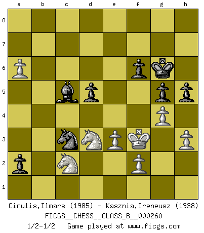 Last move : 1/2-1/2 2017 October 23 9:2:39 [Event "FICGS__CHESS__CLASS_B__000260"] [Site "FICGS"] [Date "2017.09.24"] [Round "1"] [White "Cirulis,Ilmars"] [Black "Kasznia,Ireneusz"] [Result "1/2-1/2"] [WhiteElo "1985"] [BlackElo "1938"] 1.b4 e5 2.a3 d5 3.Bb2 Nd7 4.e3 a5 5.d4 exd4 6.Qxd4 Ngf6 7.Nf3 Bd6 8.b5 c5 9.bxc6 bxc6 10.c4 Rb8 11.cxd5 cxd5 12.Ra2 O-O 13.Be2 Nc5 14.O-O Be6 15.Nbd2 Qe7 16.Ba1 Rfc8 17.Rb2 Rxb2 18.Bxb2 h6 19.a4 Nce4 20.Nb3 Bd7 21.Bb5 Bxb5 22.axb5 Qc7 23.Ba1 Ra8 24.Rc1 Qd7 25.Qa4 Ng4 26.Rf1 Qc7 27.g3 Qc2 28.Qd4 Ngf6 29.Qd1 Qc4 30.Bxf6 Nxf6 31.Nfd4 a4 32.Nd2 Qc5 33.Qc1 a3 34.Qxc5 Bxc5 35.Ra1 Ne4 36.N2b3 Bd6 37.Nc2 Ra4 38.Kg2 Kh7 39.Nc1 Rc4 40.Nd4 Rc8 41.Nce2 Rc7 42.h3 g5 43.g4 Kg6 44.Ra2 Bc5 45.Nb3 Bb4 46.Nbd4 Rb7 47.Rc2 f6 48.Rc6 Bc5 49.Kf3 Ra7 50.Nb3 a2 51.Na1 Ra5 52.Ra6 Ra3 53.Nc1 Rxa6 54.bxa6 Nc3 55.Nc2 h5 56.Nd3 1/2-1/2 Polish (Sokolsky) opening Kingside Castling by player Black (move 12) Kingside Castling by player White (move 14) This chess game ended in a draw. Follow this game move after move (download)The hallmark of the artist is simplicity. (Larry Evans) Bis zum Jahr 1971 verlief in meiner Schachkariere alles glatt. Dieses dramatische Match [Fischer-Taimanov 6:0] machte mein Leben zur Hölle. (Mark Taimanov) Fischer era un maestro de claridad y un Rey del posicionamiento astuto. Sus oponentes podían ver hacia donde se dirigía pero eran impotentes para detenerlo. (Bruce Pandolfini) La vérité est comme le meilleur coup aux échecs : elle existe, mais il faut la chercher. (Arturo Perez-Reverte) For to win one hundred victories in one hundred battles is not the acme of skill. To subdue the enemy without fighting is the acme of skill. (Sun Tzu)
