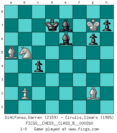 Last move : 1-0 2018 February 22 12:38:52 [Event "FICGS__CHESS__CLASS_B__000260"] [Site "FICGS"] [Date "2017.09.24"] [Round "1"] [White "DiAlfonso,Darren"] [Black "Cirulis,Ilmars"] [Result "1-0"] [WhiteElo "2159"] [BlackElo "1985"] 1.d4 e6 2.c4 b6 3.e4 Bb7 4.Bd3 Nc6 5.Ne2 g6 6.Nbc3 Bg7 7.Be3 Nge7 8.O-O O-O 9.Qd2 d5 10.cxd5 exd5 11.e5 f6 12.f4 Nb4 13.Bb1 fxe5 14.a3 Na6 15.fxe5 Rxf1+ 16.Kxf1 c5 17.Kg1 Qd7 18.Ba2 c4 19.Bg5 Nc7 20.Rf1 Rf8 21.Nf4 Ne6 22.Nxe6 Rxf1+ 23.Kxf1 Qxe6 24.Bb1 a6 25.Bc2 b5 26.Kg1 Nc6 27.Bd1 Nxd4 28.Qxd4 Bxe5 29.Qg4 Qxg4 30.Bxg4 d4 31.Ne2 Kf7 32.Kf2 a5 33.Bd2 d3 34.Nc3 b4 35.axb4 axb4 36.Nd1 Bd4+ 37.Ke1 Bc5 38.g3 Kf6 39.Bd7 Ba6 40.Bc6 Ke5 41.Bf4+ Ke6 42.Kd2 Bd4 43.Bh6 Kd6 44.Be4 Bc8 45.Bf8+ Ke5 46.Ba8 Bg1 47.Bxb4 Bxh2 48.Ne3 Be6 49.Kc3 d2 50.Ba5 Kd6 51.Kd4 d1Q+ 52.Nxd1 Bxg3 53.Bb4+ Kd7 54.Nc3 Be1 55.Be4 Bf2+ 56.Ke5 Bg3+ 57.Kf6 Bd6 58.Ba5 Bc5 59.Nb5 Be7+ 60.Kg7 Bf5 61.Bd5 Be6 62.Bg2 1-0 Queen's pawn : Keres defense Kingside Castling by player White (move 8) Kingside Castling by player Black (move 8) Promotion Queen by player Black (move 51) Player White won this chess game. Follow this game move after move (download)Spassky will not be psyched out by Fischer. (Mike Goodall) Ich war schon mal beim Dopingtest. Da musste ich Urin abgeben, während Dritte zusahen. (Elisabeth Pähtz) El juego de Fischer siempre fue nítido, racional y brillante. Uno de los mejores por siempre. (Dave Regis) Nous sommes les pions de la mystérieuse partie d'Echecs jouée par Dieu. Il nous déplace, nous arrête, nous pousse encore, puis nous lance un à un dans la boîte du Néant. Epitaphe sur la tombe de David Janowsky (1868-1927). But they are useless. They can only give you answers. (Pablo Picasso, about computers)