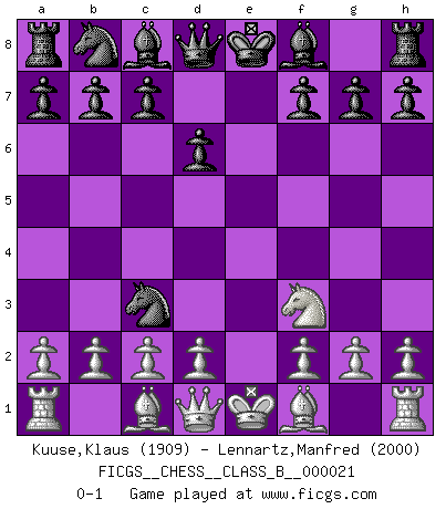 Last move : 0-1 2007 May 30 11:37:4 [Event "FICGS__CHESS__CLASS_B__000021"] [Site "FICGS"] [Date "2007.04.16"] [Round "1"] [White "Kuuse,Klaus"] [Black "Lennartz,Manfred"] [Result "0-1"] [WhiteElo "1909"] [BlackElo "2000"] 1.e4 e5 2.Nf3 Nf6 3.Nxe5 d6 4.Nf3 Nxe4 5.Nc3 Nxc3 0-1 This chess game has been lost on time (started : 2007.04.16 8:55:30) Petrov : Nimzovich attack Player Black won this chess game. Follow this game move after move (download)Chess is played with the mind and not with the hands ! (Renaud and Kahn) Wir können eben der zündenden Macht des Opfers nicht wiederstehen, denn die Begeisterung für das Opfer liegt in der Natur des Menschen. (Rudolf Spielmann) Observen a Garry Kasparov. Después de una derrota, invariablemente el gana la próxima partida. Prácticamente hace pedazos a su siguiente oponente. Eso es algo que tenemos que aprender a lograr. (Maurice Ashley) Le plus grand jeu de l'esprit jamais inventé, plus vous l'apprenez, plus vous y prenez du plaisir. (Garry Kasparov) At last I discovered the true beauty of chess. So I proposed to her. (Dinesh De Silva)
