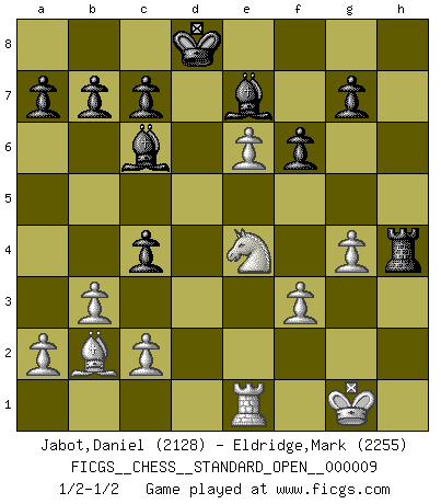 Last move : 1/2-1/2 2018 February 16 9:52:16 [Event "FICGS__CHESS__STANDARD_OPEN__000009"] [Site "FICGS"] [Date "2017.09.26"] [Round "1"] [White "Jabot,Daniel"] [Black "Eldridge,Mark"] [Result "1/2-1/2"] [WhiteElo "2128"] [BlackElo "2255"] 1.e4 e5 2.Nf3 Nc6 3.Bb5 Nf6 4.O-O Nxe4 5.d4 Nd6 6.Bxc6 dxc6 7.dxe5 Nf5 8.Qxd8+ Kxd8 9.Nc3 Ke8 10.h3 Be6 11.Rd1 Be7 12.b3 Rd8 13.Bb2 h5 14.Ne4 Bd5 15.Re1 c5 16.Rad1 Bc6 17.Rxd8+ Kxd8 18.g4 hxg4 19.hxg4 Nh4 20.Nxh4 Rxh4 21.f3 c4 22.e6 f6 1/2-1/2 Ruy Lopez : Berlin defense, Open variation Kingside Castling by player White (move 4) This chess game ended in a draw. Follow this game move after move (download)Openings teach you openings. Endgames teach you chess ! (Stephan Gerzadowicz) Charakterschwächen offenbaren sich normalerweise während einer Schachpartie. (Garry Kasparov) Debes de llevar a tu oponente hacia un profundo y obscuro bosque donde 2+2=5, y el camino que conduce a la salida es suficientemente ancho para solamente uno. (Mikhail Tal) Fischer est le meilleur joueur du monde et Karpov n'est qu'un joueur de bistrot. (Garry Kasparov, agé de 16 ans) A journey of a thousand sites begins with a single click. (Author unknown)