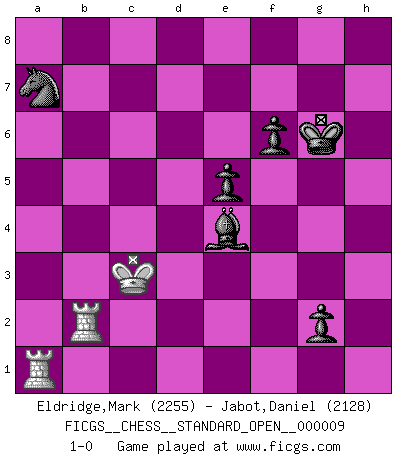 Last move : 1-0 2018 November 5 20:47:54 [Event "FICGS__CHESS__STANDARD_OPEN__000009"] [Site "FICGS"] [Date "2017.09.26"] [Round "2"] [White "Eldridge,Mark"] [Black "Jabot,Daniel"] [Result "1-0"] [WhiteElo "2255"] [BlackElo "2128"] 1.e4 c5 2.Nf3 d6 3.d4 cxd4 4.Nxd4 Nf6 5.Nc3 a6 6.Be3 e6 7.Be2 Qc7 8.Qd2 b5 9.f3 Nbd7 10.g4 h6 11.a3 Bb7 12.O-O-O d5 13.exd5 Nxd5 14.Nxd5 Bxd5 15.Bf4 Qb6 16.Rhe1 Nf6 17.h4 b4 18.axb4 Bxb4 19.c3 Rc8 20.g5 Nh5 21.Be5 hxg5 22.Nc2 f6 23.Bd4 Qa5 24.Nxb4 Qxb4 25.hxg5 Qa5 26.Qc2 Kf7 27.g6+ Kg8 28.b4 Qa3+ 29.Kd2 Nf4 30.Ra1 Qb3 31.Qxb3 Bxb3 32.Bxa6 Rh2+ 33.Kc1 Ra8 34.Ra5 Nxg6 35.Re2 Rh1+ 36.Kb2 Bd5 37.Rf2 Nf4 38.Bb5 Rb8 39.Rd2 Bxf3 40.Ba7 Rxb5 41.Rxb5 Be4 42.Rb8+ Kf7 43.c4 Nd3+ 44.Kc3 Ne5 45.Rd4 Rh3+ 46.Kb2 Nd3+ 47.Ka2 Nc1+ 48.Kb2 Nd3+ 49.Ka1 Bf5 50.Rd7+ Kg6 51.R8b7 Rh7 52.Bc5 e5 53.Re7 Nf4 54.Rbc7 Bd3 55.Be3 Kf5 56.b5 Rh3 57.Ba7 Rh1+ 58.Ka2 Bb1+ 59.Ka3 Be4 60.Rcd7 Ra1+ 61.Kb3 Rb1+ 62.Ka2 Ne2 63.Ka3 g5 64.Rd2 Nc1 65.Rf2+ Kg6 66.Re6 Bf5 67.Rd6 g4 68.b6 g3 69.Rb2 Ra1+ 70.Kb4 Be4 71.Kb5 Ra3 72.c5 g2 73.Rd1 Nb3 74.c6 Nd4+ 75.Kb4 Rxa7 76.bxa7 Nxc6+ 77.Kc3 Nxa7 78.Ra1 1-0 This chess game has been lost on time (started : 2017.09.26 13:46:33) Sicilian : Najdorf, Byrne (English) attack Queenside Castling by player White (move 12) 10 pieces endgame at move 76 : White KRRP , Black KBNPPP WHITE : King + 2 Rooks 1 Pawn BLACK : King + 1 Bishop 1 Knight 3 Pawns 9 pieces endgame at move 77 : White KRR , Black KBNPPP WHITE : King + 2 Rooks BLACK : King + 1 Bishop 1 Knight 3 Pawns Player White won this chess game. Follow this game move after move (download)The hallmark of the artist is simplicity. (Larry Evans) Das Schach ist nichts für kleine Geister, es beansprucht einen vollen Mann, der sich nicht sklavisch an das Überlieferte hält, sondern selbständig die Tiefen des Spiels zu ergründen sucht. (Wilhelm Steinitz) Nunca antes ha habido un jugador de Ajedrez con tal conocimiento a fondo de las complejidades del juego y una inmensa voluntad absolutamente indomable de ganar. Yo pienso que Fischer es el jugador mas grande que jamás haya existido. (Lisa Lane) Avec des compensations pour le matériel en plus... (Anonyme) Before all elsed, be armed. (Niccolo Machiavelli)