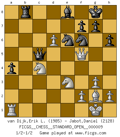 Last move : 1/2-1/2 2018 July 31 0:46:31 [Event "FICGS__CHESS__STANDARD_OPEN__000009"] [Site "FICGS"] [Date "2017.09.26"] [Round "1"] [White "van Dijk,Erik L."] [Black "Jabot,Daniel"] [Result "1/2-1/2"] [WhiteElo "1985"] [BlackElo "2128"] 1.d4 Nf6 2.c4 e6 3.g3 d5 4.Bg2 dxc4 5.Nf3 a6 6.O-O Nc6 7.Bg5 Be7 8.e3 Nd5 9.Bxe7 Ncxe7 10.Qd2 b5 11.b3 cxb3 12.axb3 Bb7 13.Ne5 O-O 14.Rc1 Ra7 15.Qe1 Qa8 16.e4 Nf6 17.Rxc7 Bc6 18.Rxa7 Qxa7 19.Qe3 Rd8 20.Na3 Be8 21.Nc2 a5 22.Qd2 a4 23.bxa4 bxa4 24.Nc4 h6 25.N4e3 Qb6 26.d5 exd5 27.exd5 Rb8 28.Nc4 Qc5 29.N2e3 Nc8 30.d6 Nb6 31.Qb2 Nbd7 32.Qc2 Nf8 33.Qf5 Ne6 1/2-1/2 Catalan : Open, 5.Nf3 Kingside Castling by player White (move 6) Kingside Castling by player Black (move 13) This chess game ended in a draw. Follow this game move after move (download)I'm not afraid of Spassky. The world knows I'm the best. You don't need a match to prove it. (Bobby Fischer) Am wohlsten fühle ich mich, wenn ich sehe, wie sich mein Gegner im Todeskampf windet. (Robert James Fischer) Los problemas de Ajedrez exigen del compositor las mismas virtudes que caracterizan todo el arte de valor: originalidad, invención, concisión, armonía, complejidad e insinceridad explendida. (Vladimir Nabokov) On est toujours la mazette de quelqu'un d'autre. (Anonyme) Convictions are more dangerous enemies of truth than lies. (Friedrich Nietzsche)