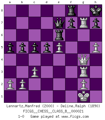Last move : 1-0 2007 July 10 3:36:2 [Event "FICGS__CHESS__CLASS_B__000021"] [Site "FICGS"] [Date "2007.04.16"] [Round "1"] [White "Lennartz,Manfred"] [Black "Deline,Ralph"] [Result "1-0"] [WhiteElo "2000"] [BlackElo "1890"] 1.e4 e5 2.Nf3 Nc6 3.Bb5 a6 4.Ba4 Nf6 5.O-O Nxe4 6.d4 b5 7.Bb3 d5 8.dxe5 Be6 9.Nbd2 Nc5 10.c3 Nxb3 11.Nxb3 Be7 12.Nfd4 Qd7 13.Nxc6 Qxc6 14.Be3 O-O 15.f4 Qd7 16.Bc5 g6 17.Qd2 c6 18.Bxe7 Qxe7 19.Nd4 Bd7 20.Rae1 Rfe8 21.f5 Bxf5 22.Nxf5 gxf5 23.Rxf5 Qa7+ 24.Kh1 Re6 25.Qf4 Qe7 26.Re3 Re8 27.h4 Rf8 28.h5 Kh8 29.Rg3 Qe8 30.Kh2 a5 31.Rfg5 Qd8 32.Qf5 Rh6 33.Qg4 Qe8 34.Kg1 c5 35.Qf4 Re6 36.Rg7 Qe7 37.Qg4 1-0 Ruy Lopez : Open, 7.Bb3 Kingside Castling by player White (move 5) Kingside Castling by player Black (move 14) Player White won this chess game. Follow this game move after move (download)First-class players lose to second class players because second-class players sometimes play a first-class game. (Tarrasch) Die FIDE ist dabei in die Hände der russischen Mafia zu fallen. (Larry Evans) No existe un remordimiento como el remordimiento del Ajedrez. (H. G. Wells) Les ravages du H expliquent la différence de niveau entre Tal et Thal [Abergel]. Art is not a thing, it is a way. (Elbert Hubbard)