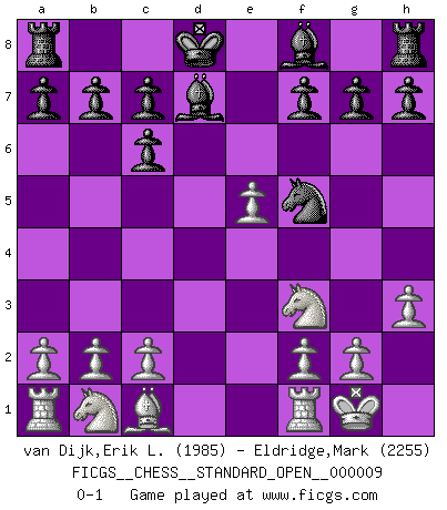 Last move : 0-1 2017 November 17 15:49:34 [Event "FICGS__CHESS__STANDARD_OPEN__000009"] [Site "FICGS"] [Date "2017.09.26"] [Round "2"] [White "van Dijk,Erik L."] [Black "Eldridge,Mark"] [Result "0-1"] [WhiteElo "1985"] [BlackElo "2255"] 1.e4 e5 2.Nf3 Nc6 3.Bb5 Nf6 4.O-O Nxe4 5.d4 Nd6 6.Bxc6 dxc6 7.dxe5 Nf5 8.Qxd8+ Kxd8 9.h3 Bd7 0-1 This chess game has been lost on time (started : 2017.09.26 13:46:33) Ruy Lopez : Berlin defense, Open variation Kingside Castling by player White (move 4) Player Black won this chess game. Follow this game move after move (download)Chess is thirty to forty percent psychology. You don't have this when you play a computer. I can't confuse it. (Judith Polgar) Der Verteidiger gebe der Gewalt nach, aber nur der Gewalt. Er schaffe sich nicht freiwillig, etwa aus Blindheit oder aus Schrecken, irgendwelche Schwächen. Er lasse sich nicht bluffen. (Emanuel Lasker) Hasta este punto, las blancas han seguido un análisis bien conocido. Pero ahora el hace un error fatal: empieza a usar su propia cabeza. (Siegbert Tarrasch) Il n'y a pas de prix trop élevé au scalp de l'ennemi. (Koblentz) All art requires courage. (Anne Tucker)