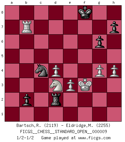 Last move : 1/2-1/2 2017 December 28 15:28:44 [Event "FICGS__CHESS__STANDARD_OPEN__000009"] [Site "FICGS"] [Date "2017.09.26"] [Round "1"] [White "Bartsch,Reinhard Andrea"] [Black "Eldridge,Mark"] [Result "1/2-1/2"] [WhiteElo "2119"] [BlackElo "2255"] 1.c4 e5 2.g3 Nf6 3.Bg2 d5 4.cxd5 Nxd5 5.Nf3 Nc6 6.O-O Nb6 7.b3 Be7 8.Nc3 O-O 9.Bb2 Bg4 10.Rc1 f6 11.h3 Be6 12.Kh2 Qe8 13.Ne4 a5 14.d4 Rd8 15.Nc5 Bxc5 16.Rxc5 e4 17.Nh4 f5 18.f3 Bd5 19.fxe4 fxe4 20.e3 Qe6 21.Ba3 g6 22.Qc2 Rxf1 23.Bxf1 Rf8 24.Bc4 Nb4 25.Bxb4 axb4 26.Ng2 Bxc4 27.bxc4 c6 28.Nf4 Qf7 29.Qxe4 Ra8 30.Re5 Nxc4 31.Re7 Nd2 32.Rxf7 Nxe4 33.Rxb7 Rxa2+ 34.Kg1 Rb2 35.g4 b3 36.Rb8+ Kg7 37.Nd3 Rb1+ 38.Kg2 Nd2 39.Rb7+ Kg8 40.Ne5 Rb2 41.Nxc6 Rc2 42.Nb4 Nc4 43.Kf3 Rh2 44.Nd3 b2 45.h4 Rd2 46.Rb8+ Kg7 47.Rb7+ Kf8 1/2-1/2 English Opening Kingside Castling by player White (move 6) Kingside Castling by player Black (move 8) This chess game ended in a draw. Follow this game move after move (download)You need not play well - just help your opponent to play badly. (Genrikh Chepukaitis) Ich habe kein Problem mit Frauen, sondern nur mit dem Niveau ihres Schachspiels (Judith Polgar) Fischer deseaba darle a los Rusos una sopa de su propia medicina. (Larry Evans) Le génie consiste à savoir transgresser les règles au moment opportun. (Teichmann) Waiting for chance ? Play in casinos. (FICGS proverb)