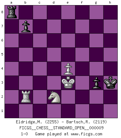 Last move : 1-0 2017 December 17 11:38:26 [Event "FICGS__CHESS__STANDARD_OPEN__000009"] [Site "FICGS"] [Date "2017.09.26"] [Round "2"] [White "Eldridge,Mark"] [Black "Bartsch,Reinhard Andrea"] [Result "1-0"] [WhiteElo "2255"] [BlackElo "2119"] 1.e4 c5 2.Nf3 d6 3.d4 cxd4 4.Nxd4 Nf6 5.Nc3 a6 6.Be3 e5 7.Nb3 Be7 8.f3 Be6 9.Qd2 O-O 10.O-O-O a5 11.a4 Qc7 12.g4 Na6 13.Qg2 Nb4 14.Kb1 d5 15.g5 d4 16.gxf6 Bxf6 17.Nb5 Qc6 18.Bc1 Rfc8 19.Na3 Nxc2 20.Qxc2 Qxa4 21.Bb5 Qxb3 22.Qxb3 Bxb3 23.Rdg1 Be7 24.Bh6 Bf8 25.Rg3 f6 26.f4 a4 27.fxe5 fxe5 28.Bd2 Rc7 29.Rg5 Rc5 30.Bb4 h6 31.Bxc5 hxg5 32.Bxf8 Rxf8 33.Bc4+ Kh7 34.Bxb3 axb3 35.Nc4 Rf4 36.Re1 d3 37.h3 Kh6 38.Kc1 Rf2 39.Kd1 Rc2 40.Nd2 Rxb2 41.Re3 Kh5 42.Rxd3 g4 43.Ke2 g5 44.hxg4+ Kxg4 45.Ke3 Kh3 46.Rd5 Rc2 47.Kd3 g4 48.Rxe5 g3 49.Rg5 Ra2 50.Ke3 Ra8 51.Rb5 b2 52.Rxb2 1-0 Sicilian : Najdorf, Byrne (English) attack Kingside Castling by player Black (move 9) Queenside Castling by player White (move 10) 10 pieces endgame at move 44 : White KRNP , Black KRPPPP WHITE : King + 1 Rook 1 Knight 1 Pawn BLACK : King + 1 Rook 4 Pawns 9 pieces endgame at move 48 : White KRNP , Black KRPPP WHITE : King + 1 Rook 1 Knight 1 Pawn BLACK : King + 1 Rook 3 Pawns 8 pieces endgame at move 52 : White KRNP , Black KRPP WHITE : King + 1 Rook 1 Knight 1 Pawn BLACK : King + 1 Rook 2 Pawns Player White won this chess game. Follow this game move after move (download)The winner of the game is the player who makes the next-to-last mistake. (Savielly Tartakover) Der Bart als Geschlechtszeichen mitten im Gesicht ist obszön. Daher gefällt er den Weibern. [Zugegeben, kein Schachzitat, aber unglaublich originell] (Arthur Schopenhauer) Cuando le juegas a Fischer, no es una cuestion de si vas a ganar o perder. Es una cuestion de si vas a sobrevivir. (Boris Spassky) Même un GMI sait rarement calculer sur plus de cinq coups une attaque à sacrifices. (Rudolf Spielmann) No, no, you're not thinking; you're just being logical. (Niels Bohr)