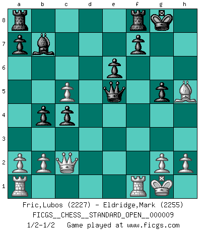 Last move : 1/2-1/2 2018 January 4 14:3:59 [Event "FICGS__CHESS__STANDARD_OPEN__000009"] [Site "FICGS"] [Date "2017.09.26"] [Round "2"] [White "Fric,Lubos"] [Black "Eldridge,Mark"] [Result "1/2-1/2"] [WhiteElo "2227"] [BlackElo "2255"] 1.d4 d5 2.c4 c6 3.Nf3 Nf6 4.Nc3 e6 5.Bg5 h6 6.Bh4 dxc4 7.e4 g5 8.Bg3 b5 9.Ne5 Nbd7 10.Be2 Bg7 11.O-O Nxe5 12.Bxe5 O-O 13.f4 b4 14.fxg5 hxg5 15.Bxf6 Bxf6 16.e5 Be7 17.Ne4 c5 18.Nxc5 Bxc5 19.dxc5 Qd5 20.Bh5 Bb7 21.Qc2 Qxe5 1/2-1/2 QGD Slav : 4.Nc3 Kingside Castling by player White (move 11) Kingside Castling by player Black (move 12) This chess game ended in a draw. Follow this game move after move (download)A sacrifice is best refuted by accepting it. (Wilhelm Steinitz) Schach ist gnadenlos. Du mußt bereit sein zu töten. (Nigel Short) El Ajedrez es en su esencia, un juego. En su forma, un arte. Y en su ejecución, una ciencia. (Baron Tassilo) Botvinnik disait en comparant les échecs à la musique: Il existe une science dont le but est l'étude de l'acoustique et des sons. Mais il y a aussi un art qui se sert de l'océan des sons : c'est la musique. De toute évidence, il en est de même pour la pensée. La logique est l'étude des lois de la réflexion et les échecs reflètent, en tant qu'art, le côté logique de la réflexion, sous la forme d'images artistiques... Extrait de Fischer - Spassky, Reykjavik 1972 par Alexander & F. Wyndham (Ed. Solar), p 37. Sometimes it pays to stay in bed in Monday, rather than spending the rest of the week debugging Monday's code. (Dan Salomon)