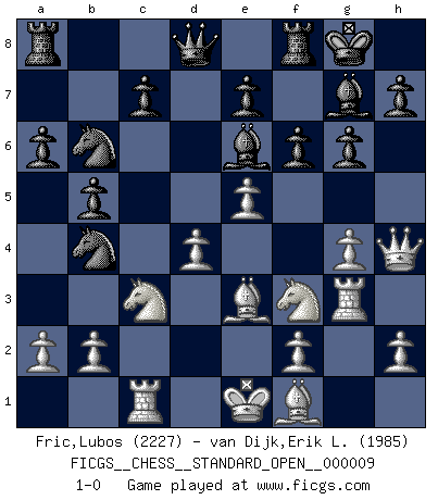 Last move : 1-0 2018 February 6 0:57:26 [Event "FICGS__CHESS__STANDARD_OPEN__000009"] [Site "FICGS"] [Date "2017.09.26"] [Round "1"] [White "Fric,Lubos"] [Black "van Dijk,Erik L."] [Result "1-0"] [WhiteElo "2227"] [BlackElo "1985"] 1.Nf3 Nf6 2.d4 g6 3.c4 Bg7 4.Nc3 d5 5.Qb3 dxc4 6.Qxc4 O-O 7.e4 a6 8.e5 Nfd7 9.Be3 b5 10.Qd5 Nb6 11.Qe4 Bf5 12.Qh4 f6 13.g4 Be6 14.Rg1 Nc6 15.Rg3 Nb4 16.Rc1 1-0 This chess game has been lost on time (started : 2017.09.26 13:46:33) Reti Opening Kingside Castling by player Black (move 6) Player White won this chess game. Follow this game move after move (download)On the chessboard, lies and hypocrisy do not survive long. (Emanuel Lasker) Ein Remis kann durch Wiederholung von drei Zügen oder durch einen schlechte Zug erreicht werden. (Savielly Grigorievitsch Tartakower) Bendita sea la memoria de aquel que dio al mundo este juego inmortal. (A. G. Gardiner) On a dit que l'homme se distingue de l'animal par le fait qu'il achète plus de livres qu'il ne peut en lire. Je voudrais suggérer qu'inclure à la liste des livres quelques livres d'échecs rendrait la distinction manifeste. (Edward Lasker) Always remember that you are unique; just like everyone else. (Unknown)