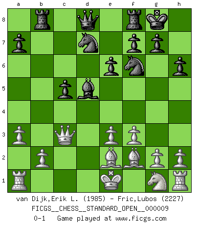 Last move : 0-1 2018 February 4 12:52:19 [Event "FICGS__CHESS__STANDARD_OPEN__000009"] [Site "FICGS"] [Date "2017.09.26"] [Round "2"] [White "van Dijk,Erik L."] [Black "Fric,Lubos"] [Result "0-1"] [WhiteElo "1985"] [BlackElo "2227"] 1.d4 Nf6 2.c4 e6 3.Nc3 Bb4 4.Qc2 O-O 5.a3 Bxc3+ 6.Qxc3 b6 7.Bg5 Bb7 8.f3 h6 9.Bh4 d5 10.e3 c5 11.dxc5 bxc5 12.cxd5 Bxd5 13.Bf2 Nbd7 14.Be2 Rb8 0-1 This chess game has been lost on time (started : 2017.09.26 13:46:33) Nimzo-Indian : Classical variation Kingside Castling by player Black (move 4) Player Black won this chess game. Follow this game move after move (download)The defensive power of a pinned piece is only imaginary. (Aaron Nimzovich) Ich bewundere Kasparows phantasievolle Angriffssiege aus den Achtzigern und Neunzigern, aber wenn man sie mit dem Computer überprüft, nimmt der Computer in jeder zweiten Partie die Opfer an, verteidigt sich und gewinnt. (Vladimir Kramnik) Los problemas de Ajedrez exigen del compositor las mismas virtudes que caracterizan todo el arte de valor: originalidad, invención, concisión, armonía, complejidad e insinceridad explendida. (Vladimir Nabokov) Plusieurs personnes se sont demandées comment Tal faisait pour gagner... En fait, c'est très simple ! Il met ses pièces au centre de l'échiquier et les sacrifie quelque part ! (David Bronstein) As the days dwindle down... to a precious few. (Maxwell Anderson)