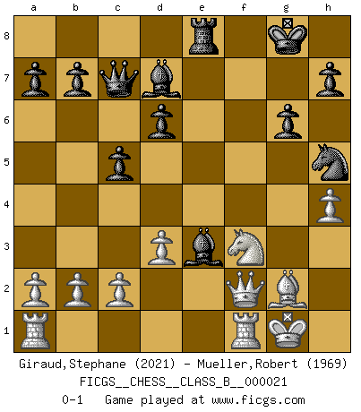 Last move : 0-1 2007 May 28 16:17:27 [Event "FICGS__CHESS__CLASS_B__000021"] [Site "FICGS"] [Date "2007.04.16"] [Round "1"] [White "Giraud,Stephane"] [Black "Mueller,Robert"] [Result "0-1"] [WhiteElo "2021"] [BlackElo "1969"] 1.e4 c5 2.Nf3 Nc6 3.g3 g6 4.Bg2 Bg7 5.O-O Nf6 6.Nc3 d6 7.d3 O-O 8.h3 Be6 9.Ng5 Bd7 10.f4 Qc8 11.Kh2 Qc7 12.Be3 Nd4 13.Nf3 e5 14.Ne2 Nxe2 15.Qxe2 exf4 16.Bxf4 Nh5 17.Bc1 Rae8 18.Qf2 f5 19.exf5 Rxf5 20.h4 Be5 21.Bf4 Rxf4 22.gxf4 Bxf4+ 23.Kg1 Be3 0-1 Sicilian defense Kingside Castling by player White (move 5) Kingside Castling by player Black (move 7) Player Black won this chess game. Follow this game move after move (download)I don't believe in psychology. I believe in good moves. (Bobby Fischer) Im Spitzenschach von heute geht es nur um Vorbereitung, um tiefgründige, sorgfältige Eröffnungsvorbereitung. (Nigel Short) El Ajedrez tiene tanto misterio como las mujeres. (Purdy) Le profane ne songe pas à la somme de jouissance dont il se prive, qui méconnaît ce jeu aux ressources aussi variées que passionnantes. (Jean-Marie Jeanton-Lamarche) Control your own destiny or someone else will. (Jack Welch)