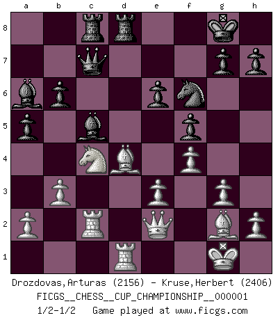 Last move : 1/2-1/2 2017 October 26 17:51:24 [Event "FICGS__CHESS__CUP_CHAMPIONSHIP__000001"] [Site "FICGS"] [Date "2017.09.28"] [Round "1"] [White "Drozdovas,Arturas"] [Black "Kruse,Herbert"] [Result "1/2-1/2"] [WhiteElo "2156"] [BlackElo "2406"] 1.d4 Nf6 2.c4 e6 3.g3 d5 4.Bg2 Bb4+ 5.Nd2 O-O 6.Ngf3 b6 7.O-O Bb7 8.b3 Nbd7 9.Bb2 Rc8 10.e3 a5 11.Rc1 Ne4 12.Nb1 Ba6 13.Qe2 Qe7 14.Ne1 Nd6 15.Nf3 Ne4 16.Rfd1 f5 17.Ne1 Bd6 18.Nc3 Nxc3 19.Rxc3 c5 20.Nf3 Nf6 21.Rc2 Rfd8 22.dxc5 Bxc5 23.Ne5 Bd6 24.Bd4 Qc7 25.f4 dxc4 26.Nxc4 Bc5 27.Qe1 Bb4 28.Qe2 Bc5 29.Qe1 Bb4 30.Qe2 Bc5 1/2-1/2 Catalan : Closed Kingside Castling by player Black (move 5) Kingside Castling by player White (move 7) This chess game ended in a draw. Follow this game move after move (download)When you play Bobby, it is not a question if you win or lose. It is a question if you survive. (Boris Spassky) Es gibt zwei Arten von Opfern: Korrekte und meine. (Mikhail Nekhemyevich Tal) Todos los jugadores de Ajedrez deberían tener un pasatiempo. (Savielly Tartakower) Il (Jacob Murray) ne joue pas pour le bon coup, mais pour le meilleur. (Eloi Relange) Two beer, or not two beer. (Unknown)