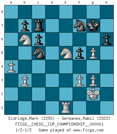 Last move : 1/2-1/2 2018 January 4 12:18:13 [Event "FICGS__CHESS__CUP_CHAMPIONSHIP__000001"] [Site "FICGS"] [Date "2017.09.28"] [Round "1"] [White "Eldridge,Mark"] [Black "Germanes,Ramil"] [Result "1/2-1/2"] [WhiteElo "2255"] [BlackElo "2323"] 1.d4 Nf6 2.c4 e6 3.g3 d5 4.Bg2 Be7 5.Nf3 O-O 6.O-O dxc4 7.Qc2 a6 8.a4 Bd7 9.Qxc4 Bc6 10.Bf4 Bd6 11.Qc1 a5 12.Nc3 Na6 13.Rd1 Nb4 14.Ne1 Bxg2 15.Kxg2 Nfd5 16.Bxd6 Qxd6 17.e4 Nf6 18.Qe3 Rad8 19.Rac1 Qb6 20.Nf3 c6 21.Nb1 Ne8 22.Na3 Nd6 23.Ne5 Rfe8 24.h4 Qa7 25.b3 f6 26.Nec4 h6 27.Qf3 Nf7 28.Qh5 Rxd4 29.Qxa5 Qxa5 30.Nxa5 Rxd1 31.Rxd1 Re7 32.Rd4 Na6 33.N3c4 Kf8 34.Nb6 Rc7 35.f3 Ke7 36.Rd1 g5 37.Nac4 Nc5 38.Rb1 f5 39.exf5 exf5 40.Re1+ Kf8 41.Ne5 Kg7 42.hxg5 1/2-1/2 Catalan : Closed, 5.Nf3 Kingside Castling by player Black (move 5) Kingside Castling by player White (move 6) This chess game ended in a draw. Follow this game move after move (download)Though most people love to look at the games of the great attacking masters, some of the most successful players in history have been the quiet positional players. They slowly grind you down by taking away your space, tying up your pieces, and leaving you with virtually nothing to do ! (Yasser Seirawan) Nicht daß Diemer aus Opportunismus Mitglied der NSDAP geworden wäre. Er war ein Fanatiker, in allem, was er tat. (Hans Ree) El Ajedrez es parte de una cultura y si una cultura esta en decadencia, entonces también el Ajedrez declinará. (Mikhail Botvinnik) Echiquier : carré parfait, comme la Jérusalem nouvelle décrite par l'auteur de l'Apocalypse, huit cases sur huit, exaltation du chiffre 4, symbole du cosmos aux quatre horizons... où le noir et le blanc, l'ombre et la lumière, le mal et le bien s'entremêlent et se conjuguent. (Robert Couffignal, Le Gambit du poète) If things go wrong, don't go with them. (Roger Babson)