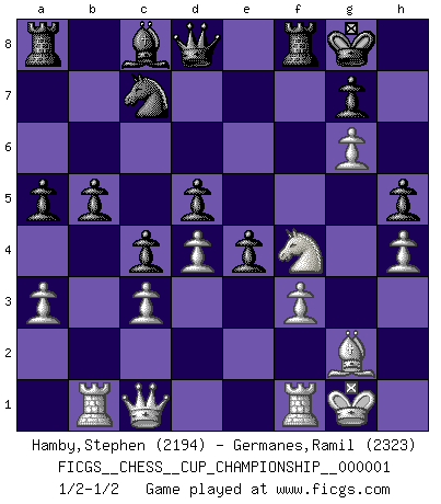 Last move : 1/2-1/2 2017 December 14 15:20:7 [Event "FICGS__CHESS__CUP_CHAMPIONSHIP__000001"] [Site "FICGS"] [Date "2017.09.28"] [Round "1"] [White "Hamby,Stephen"] [Black "Germanes,Ramil"] [Result "1/2-1/2"] [WhiteElo "2194"] [BlackElo "2323"] 1.d4 Nf6 2.c4 e6 3.Nc3 Bb4 4.f3 d5 5.a3 Bxc3+ 6.bxc3 c5 7.cxd5 exd5 8.e3 c4 9.Ne2 Nc6 10.g4 O-O 11.Rb1 Na5 12.Bg2 Nb3 13.O-O a5 14.Qc2 b5 15.h3 h5 16.g5 Ne8 17.e4 Nxc1 18.Qxc1 Nc7 19.h4 f6 20.g6 f5 21.Nf4 fxe4 1/2-1/2 Nimzo-Indian : Kmoch variation Kingside Castling by player Black (move 10) Kingside Castling by player White (move 13) This chess game ended in a draw. Follow this game move after move (download)I played Chess with him and would have beaten him sometimes only he always took back his last move, and ran the game out differently. (Mark Twain) Wenn ich gewinne bin ich ein Genie. Wenn nicht, dann bin ich keines. (Robert James Fischer) Ayuda a tus piezas para que ellas te puedan ayudar. (Paul Morphy) Ne tendez aucun piège pour le plaisir ! Ne jouez rien dans l'espoir que l'adversaire réagisse de façon stupide ! Prenez toujours pour acquis que l'adversaire va trouver le meilleur coup ! Ne jouez jamais de coup dans l'espoir que l'adversaire ne voie pas la menace ! Chacun de vos coups doit améliorer la position d'une façon ou d'une autre. Somewhere in the world there is an epigram for every dilemma. (Hendrik Willem van Loon)