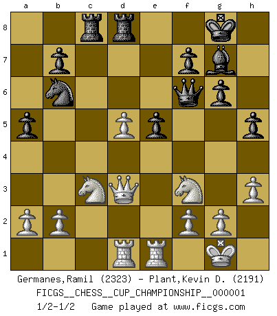 Last move : 1/2-1/2 2017 December 7 19:45:42 [Event "FICGS__CHESS__CUP_CHAMPIONSHIP__000001"] [Site "FICGS"] [Date "2017.09.28"] [Round "1"] [White "Germanes,Ramil"] [Black "Plant,Kevin D."] [Result "1/2-1/2"] [WhiteElo "2323"] [BlackElo "2191"] 1.d4 d5 2.c4 c6 3.Nf3 Nf6 4.Nc3 e6 5.Bg5 h6 6.Bxf6 Qxf6 7.e3 Nd7 8.Bd3 dxc4 9.Bxc4 g6 10.e4 e5 11.O-O Bg7 12.d5 Nb6 13.Bb3 O-O 14.h3 cxd5 15.exd5 a5 16.Re1 Bf5 17.Rc1 h5 18.Bc2 Bxc2 19.Qxc2 Rfd8 20.Rcd1 Rac8 21.Qd3 1/2-1/2 QGD Slav : 4.Nc3 Kingside Castling by player White (move 11) Kingside Castling by player Black (move 13) This chess game ended in a draw. Follow this game move after move (download)Chess is the gymnasium of the mind. (Blaise Pascal) Obwohl ich vom Stil her kaum zu den Priestern der Schachkunst gezählt werde, halte ich Schach doch für eine Kunst. (Tigran Petrosjan) El poder defensivo de una pieza clavada, solamente es imaginario. (Aaron Nimzovich) Des idées, des idées, j'en ai cent, j'en ai mille. Des bonnes, des mauvaises, applicables, irréalisables... Il suffit de faire le tri ! (Roos) When you've done things right people won't know you've done anything at all. (Futurama)