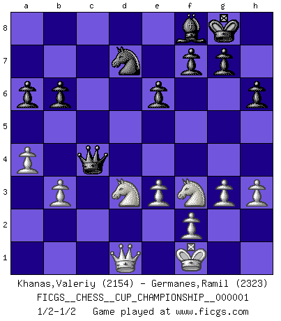 Last move : 1/2-1/2 2017 November 10 23:28:15 [Event "FICGS__CHESS__CUP_CHAMPIONSHIP__000001"] [Site "FICGS"] [Date "2017.09.28"] [Round "1"] [White "Khanas,Valeriy"] [Black "Germanes,Ramil"] [Result "1/2-1/2"] [WhiteElo "2154"] [BlackElo "2323"] 1.d4 Nf6 2.c4 e6 3.Nf3 d5 4.g3 Be7 5.Bg2 O-O 6.O-O dxc4 7.Qc2 a6 8.a4 Bd7 9.Qxc4 Bc6 10.Bf4 Bd6 11.Bg5 Nbd7 12.Nc3 h6 13.Bxf6 Nxf6 14.Rfd1 Qe7 15.Nd2 Bxg2 16.Kxg2 Rfd8 17.Rac1 c6 18.e3 Bb4 19.Nf3 Rac8 20.Ne5 Bd6 21.Nf3 Bb4 22.Qb3 c5 23.Ne2 b6 24.dxc5 Rxd1 25.Qxd1 Rxc5 26.Rxc5 Bxc5 27.Nf4 Qc7 28.h3 Nd7 29.Nd3 Bf8 30.Kf1 Qc4 31.b3 1/2-1/2 Queen's pawn game Kingside Castling by player Black (move 5) Kingside Castling by player White (move 6) This chess game ended in a draw. Follow this game move after move (download)A great player and a great example for many. His book My 60 Memorable Games had a big impact on me. It is a shame he didn't continue to enrich the world of chess with his unparalleled understanding after 1972. (Jan Timman, about Bobby Fischer's death) Ich bin es gewohnt, das die Jugend mir überhaupt keinen Respekt entgegenbringt. (Alexander Morozewich) Una compensación adecuada por un sacrificio es tener una combinación sólida que conduce a una posición ganadora; una compensación adecuada por una metida de pata es dejar a tu oponente arrebatar una derrota de las fauces de la victoria. (Bruce A. Moon) La tactique, c'est ce que vous faites quand il y a quelque chose à faire; la stratégie, c'est ce que vous faites quand il n'y a rien à faire. (Savielli Tartacower) Winning isn't everything... but losing is nothing. (Mednis)