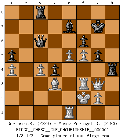 Last move : 1/2-1/2 2018 January 11 2:16:31 [Event "FICGS__CHESS__CUP_CHAMPIONSHIP__000001"] [Site "FICGS"] [Date "2017.09.28"] [Round "1"] [White "Germanes,Ramil"] [Black "Munoz Portugal,Guillermo"] [Result "1/2-1/2"] [WhiteElo "2323"] [BlackElo "2150"] 1.d4 d5 2.c4 e6 3.Nc3 Nf6 4.Bg5 Be7 5.e3 O-O 6.Nf3 h6 7.Bh4 b6 8.Bd3 Nbd7 9.O-O Bb7 10.Qe2 Ne4 11.Bg3 Nxg3 12.hxg3 c5 13.Rfd1 Nf6 14.dxc5 bxc5 15.cxd5 Nxd5 16.Nxd5 exd5 17.e4 d4 18.Ne5 g6 19.Rac1 a5 20.Bb5 Qc7 21.f4 Ra8d8 22.b3 h5 23.Ba6 Ba8 24.Bd3 Kg7 25.Qf2 Qa7 26.Rf1 Rd8e8 27.g4 f6 28.Nc4 hxg4 29.Qe2 Qd7 30.Nb6 Qc6 31.Qxg4 Rh8 32.Nxa8 Rxa8 33.Rf3 Qc8 34.Qg3 Rh5 35.f5 g5 36.e5 Qc6 37.Kf2 Rh4 38.a4 Rc8 39.Re1 c4 40.bxc4 1/2-1/2 QGD : Tartakower (Makagonov-Bondarevsky) system Kingside Castling by player Black (move 5) Kingside Castling by player White (move 9) This chess game ended in a draw. Follow this game move after move (download)If cunning alone were needed to excel, women would be the best Chess players. (Albin) Du kannst im Schach nur gut werden, wenn du das Spiel liebst. (Robert James Fischer) Observen a Garry Kasparov. Después de una derrota, invariablemente el gana la próxima partida. Prácticamente hace pedazos a su siguiente oponente. Eso es algo que tenemos que aprender a lograr. (Maurice Ashley) Pour moi, les échecs ne sont pas un jeu mais un art. (Alexandre Alekhine) A married woman is like a fish riding a bicycle. (Rodolfo d'Ettorre)
