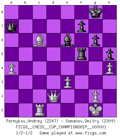 Last move : 1/2-1/2 2018 February 22 9:45:47 [Event "FICGS__CHESS__CUP_CHAMPIONSHIP__000001"] [Site "FICGS"] [Date "2017.09.28"] [Round "1"] [White "Permykov,Andrey"] [Black "Domanov,Dmitry"] [Result "1/2-1/2"] [WhiteElo "2247"] [BlackElo "2309"] 1.d3 d5 2.Nf3 Nf6 3.d4 c5 4.e3 Nc6 5.c3 g6 6.dxc5 Bg7 7.Nbd2 a5 8.Bb5 O-O 9.O-O Qc7 10.a4 e5 11.e4 dxe4 12.Ng5 e3 13.fxe3 Qe7 14.Nde4 Nxe4 15.Nxe4 Be6 16.Nd6 e4 17.Nxe4 Ne5 18.Qe2 Rad8 19.Nd6 b6 20.b4 axb4 21.cxb4 bxc5 22.bxc5 Nf3+ 23.Rxf3 Bxa1 24.Bb2 Bxb2 25.Qxb2 Rxd6 26.cxd6 Qxd6 27.Rf4 h5 28.Rd4 Qe5 29.Qc3 Kh7 30.Rc4 Qd6 31.Qd4 Qb8 32.Rc1 Rd8 33.Qc3 Qb6 34.Qe1 Rd5 35.Qc3 Qa7 36.Bc6 Rg5 37.Kh1 Rf5 38.Qd4 Qc7 39.Kg1 Rg5 40.Qd2 Qb6 41.Kh1 Rf5 42.h3 Rg5 43.Bf3 Ra5 44.Bc6 Rg5 45.Qd3 Rf5 46.Qd4 Qb8 47.Kg1 Qc7 48.h4 Kg8 49.Qd2 Qa7 1/2-1/2 Mieses Opening Kingside Castling by player Black (move 8) Kingside Castling by player White (move 9) This chess game ended in a draw. Follow this game move after move (download)I still hope to kill Fischer. (Boris Spassky) Im Spitzenschach von heute geht es nur um Vorbereitung, um tiefgründige, sorgfältige Eröffnungsvorbereitung. (Nigel Short) La mitad de las variaciones que son calculadas en una partida de torneo, resultan ser completamente superfluas. Desafortunadamente, nadie sabe por adelantado cual mitad. (Jan Tinman) Karpov est une pièce de musée. (Garry Kasparov) There's always a bigger fish. (Qui-Gon Jinn in Star Wars ep.1)