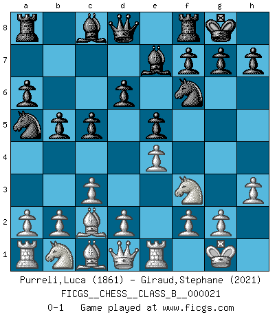 Last move : 0-1 2007 July 7 4:5:35 [Event "FICGS__CHESS__CLASS_B__000021"] [Site "FICGS"] [Date "2007.04.16"] [Round "1"] [White "Purreli,Luca"] [Black "Giraud,Stephane"] [Result "0-1"] [WhiteElo "1861"] [BlackElo "2021"] 1.e4 e5 2.Nf3 Nc6 3.Bb5 a6 4.Ba4 Nf6 5.O-O Be7 6.Re1 b5 7.Bb3 O-O 8.c3 d6 9.h3 Na5 10.Bc2 c5 0-1 This chess game has been lost on time (started : 2007.04.16 8:55:30) Ruy Lopez : Closed, 7...O-O Kingside Castling by player White (move 5) Kingside Castling by player Black (move 7) Player Black won this chess game. Follow this game move after move (download)Castle early and often. (Rob Sillars) Vielleicht wirkt die Aura früherer Spieler glanzvoller als die der heutigen Spieler, aber das liegt daran, dass man kein Programm wie Fritz hatte, das einem all die Löcher in ihren Partien zeigt. (Vladimir Kramnik) Uno por uno, yo los acribillé, mi superioridad muy pronto se volvio aparente. (Jose Capablanca) Vouloir jouer aux échecs contre soi-même est aussi paradoxal que vouloir marcher sur son ombre. (Stefan Zweig) Depression is just anger without enthusiasm. (Unknown)