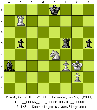 Last move : 1/2-1/2 2018 January 31 23:6:42 [Event "FICGS__CHESS__CUP_CHAMPIONSHIP__000001"] [Site "FICGS"] [Date "2017.09.28"] [Round "1"] [White "Plant,Kevin D."] [Black "Domanov,Dmitry"] [Result "1/2-1/2"] [WhiteElo "2191"] [BlackElo "2309"] 1.d4 Nf6 2.c4 g6 3.Nc3 Bg7 4.e4 O-O 5.Be2 d6 6.Nf3 e5 7.O-O Nc6 8.d5 Ne7 9.Ne1 Nd7 10.f3 f5 11.Be3 f4 12.Bf2 g5 13.Nd3 Nf6 14.c5 Ng6 15.a4 h5 16.Qe1 g4 17.Nb5 Rf7 18.cxd6 cxd6 19.Bxa7 g3 20.a5 Nxd5 21.hxg3 fxg3 22.Qxg3 Ngf4 23.Qf2 Nxe2+ 24.Qxe2 Qd7 25.Na3 Rxa7 26.exd5 Rxa5 27.Nc4 Rxa1 28.Rxa1 Qb5 29.Nf2 Bf5 30.Kh2 Qxd5 31.Rd1 Qb5 32.Rxd6 Qb4 33.Rd8+ Rf8 34.Rd1 e4 35.Nxe4 b5 36.Ncd6 Qxb2 37.Qxb2 Bxb2 38.Nxf5 Rxf5 39.Rd7 Kf8 40.Rb7 Ba3 41.Kg3 Ke8 1/2-1/2 King's Indian : 4.e4 Kingside Castling by player Black (move 4) Kingside Castling by player White (move 7) 10 pieces endgame at move 38 : White KRNPP , Black KRBPP WHITE : King + 1 Rook 1 Knight 2 Pawns BLACK : King + 1 Rook 1 Bishop 2 Pawns This chess game ended in a draw. Follow this game move after move (download)The stomach is an essential part of the Chess master. (Bent Larsen) Der 70jährige Viktor Kortschnoi: Die Rentenanstalt wollte mich zwingen in Rente zu gehen. Meine Frau erhält jetzt eine Pension- und ich zahle weiter in die Rentenkasse ein! (Viktor Kortschnoi) Ayuda a tus piezas para que ellas te puedan ayudar. (Paul Morphy) Il n'y a pas eu de défaite parce que je ne crois pas que cet ordinateur ait jamais existé. IBM a triché en refusant d'imprimer les modes de recherche de la machine. C'est évident, pendant le match, des coups décisifs ont été joués par des êtres humains. Aujourd'hui, les meilleurs spécialistes en informatique ne peuvent toujours pas expliquer comment Deep-Blue a pu jouer contre la logique des ordinateurs. IBM a gagné une guerre de communication, mais ils sont incapables de prouver que l'ordinateur a gagné tout seul. (Garry Kasparov) At last I discovered the true beauty of chess. So I proposed to her. (Dinesh De Silva)