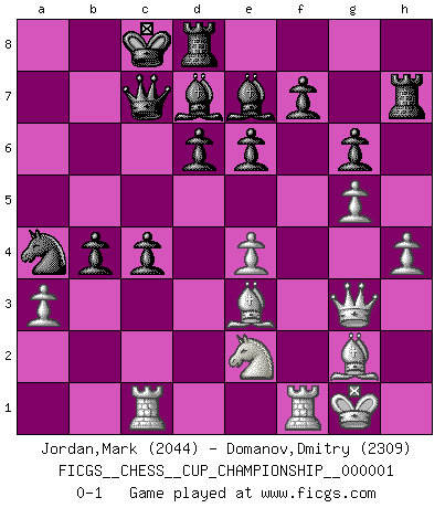 Last move : 0-1 2018 February 20 2:40:34 [Event "FICGS__CHESS__CUP_CHAMPIONSHIP__000001"] [Site "FICGS"] [Date "2017.09.28"] [Round "1"] [White "Jordan,Mark"] [Black "Domanov,Dmitry"] [Result "0-1"] [WhiteElo "2044"] [BlackElo "2309"] 1.e4 c5 2.Nf3 d6 3.d4 cxd4 4.Nxd4 Nf6 5.Nc3 a6 6.Be3 e6 7.a3 b5 8.g4 Bb7 9.Bg2 Nfd7 10.g5 Nc6 11.Nxc6 Bxc6 12.h4 Be7 13.f4 a5 14.Ne2 Nc5 15.Ng3 Qc7 16.Qg4 g6 17.Rd1 O-O-O 18.O-O h6 19.b4 Na4 20.c4 bxc4 21.Ne2 Bd7 22.Qg3 hxg5 23.fxg5 Rh7 24.Rc1 axb4 0-1 This chess game has been lost on time (started : 2017.09.28 20:39:37) Sicilian : Najdorf, Byrne (English) attack Queenside Castling by player Black (move 17) Kingside Castling by player White (move 18) Player Black won this chess game. Follow this game move after move (download)In blitz, the Knight is stronger than the Bishop. (Vlastimil Hort) Wer sich die Fähigkeit anerziehen will im Schach selbstständig zu denken, der muß alles meiden, was leblos ist: ausgeklügelte Theorien, die sich auf sehr wenige Beispiele und eine Menge Hirngespinste stützen. (Emanuel Lasker) A través de las casillas del tablero, los Indios explican el movimiento del tiempo y la edad, las influencias mas altas que controlan el mundo y los lazos que vinculan al Ajedrez con el alma humana. (Al-Masudi) Des idées, des idées, j'en ai cent, j'en ai mille. Des bonnes, des mauvaises, applicables, irréalisables... Il suffit de faire le tri ! (Roos) Creativity is allowing yourself to make mistakes. Art is knowing which ones to keep. (Scott Adams)