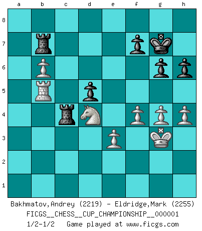 Last move : 1/2-1/2 2017 December 22 13:5:12 [Event "FICGS__CHESS__CUP_CHAMPIONSHIP__000001"] [Site "FICGS"] [Date "2017.09.28"] [Round "1"] [White "Bakhmatov,Andrey"] [Black "Eldridge,Mark"] [Result "1/2-1/2"] [WhiteElo "2219"] [BlackElo "2255"] 1.d4 d5 2.c4 c6 3.Nc3 Nf6 4.e3 e6 5.Nf3 Nbd7 6.Qc2 Bd6 7.b3 O-O 8.Be2 b6 9.O-O Bb7 10.Bb2 Qe7 11.Rfe1 Rfe8 12.Rad1 Rad8 13.h3 c5 14.dxc5 bxc5 15.Bf1 h6 16.cxd5 exd5 17.Nh4 Qe6 18.Nf5 Bf8 19.Ng3 Bd6 20.Nce2 Bb8 21.b4 c4 22.Nf5 Be5 23.Ned4 Qb6 24.f4 Bc7 25.g4 Ne4 26.a4 Bc8 27.Bg2 Ndf6 28.b5 Bxf5 29.Nxf5 c3 30.Bxc3 Qc5 31.Bxe4 Nxe4 32.Rc1 Nxc3 33.Qxc3 Qxc3 34.Rxc3 Ba5 35.Rec1 Bxc3 36.Rxc3 Kf8 37.a5 Rc8 38.Rb3 Rc4 39.Kf2 Rec8 40.b6 axb6 41.axb6 g6 42.Nd4 Rb8 43.h4 Rb7 44.Rb5 Kg7 45.Kg3 1/2-1/2 QGD Slav defense Kingside Castling by player Black (move 7) Kingside Castling by player White (move 9) This chess game ended in a draw. Follow this game move after move (download)We cannot resist the fascination of sacrifice, since a passion for sacrifices is part of a Chessplayer's nature. (Rudolf Spielman) Im Blitz ist es einfacher mit einer Figur weniger anzugreifen, als sich mit einer Mehrfigur zu verteidigen. (Mikhail Nekhemyevich Tal) El Ajedrez es un mar en el cual un mosquito puede beber y un elefante puede bañarse. (Refrán Hindú) À la honte des hommes, on sait que les lois du jeu sont les seules qui soient partout justes, claires, inviolables et exécutées. Pourquoi l'Indien qui a donné les règles du jeu d'échecs est-il obéi de bon gré dans toute la terre, et que les décrétales des papes, par exemple, sont aujourd'hui un objet d'horreur et de mépris ? C'est que l'inventeur des échecs combina tout avec justesse pour la satisfaction des joueurs, et que les papes, dans leurs décrétales, n'eurent en vue que leur seul avantage. L'Indien voulut exercer également l'esprit des hommes et leur donner du plaisir; les papes ont voulu abrutir l'esprit des hommes. Voltaire (Dictionnaire philosophique / Garnier 1967) If we don't succeed, we run the risk of failure. (George W. Bush)