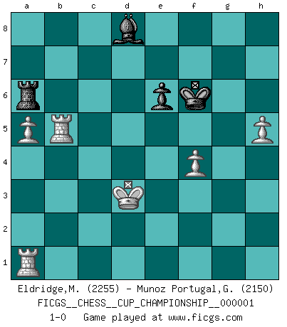 Last move : 1-0 2018 February 15 3:15:33 [Event "FICGS__CHESS__CUP_CHAMPIONSHIP__000001"] [Site "FICGS"] [Date "2017.09.28"] [Round "1"] [White "Eldridge,Mark"] [Black "Munoz Portugal,Guillermo"] [Result "1-0"] [WhiteElo "2255"] [BlackElo "2150"] 1.e4 c6 2.d4 d5 3.e5 Bf5 4.Nf3 e6 5.Be2 c5 6.Be3 cxd4 7.Nxd4 Ne7 8.Nd2 Nbc6 9.N2f3 Be4 10.O-O Bxf3 11.Nxf3 Rc8 12.Bf4 h6 13.h3 g5 14.Bh2 Bg7 15.Re1 Qc7 16.c3 Ng6 17.Bb5 a6 18.Ba4 O-O 19.Qe2 Rf8d8 20.Bxc6 bxc6 21.Qxa6 Ra8 22.Qd3 Rd8b8 23.Qc2 c5 24.c4 d4 25.Re2 Ra5 26.Ne1 Qb6 27.Bg3 Ne7 28.f3 Qc7 29.Nd3 Ra7 30.b3 Nf5 31.Bf2 Rb8a8 32.a4 Qb7 33.Nxc5 Qb8 34.Nd3 Rb7 35.Ra3 Ne7 36.Bxd4 Nc6 37.Bc3 Bf8 38.c5 Qa7 39.b4 Rxb4 40.Bxb4 Nxb4 41.Nxb4 Qxc5 42.Qxc5 Bxc5 43.Kh2 Bxb4 44.Rb3 Ba5 45.Kg3 Ra6 46.Re4 Kg7 47.Kf2 Ra7 48.Ke2 h5 49.h4 gxh4 50.Rxh4 Bd8 51.Rd4 Ba5 52.Rc4 Bd8 53.f4 f6 54.Rb8 Be7 55.Rb5 Kg6 56.exf6 Bxf6 57.a5 Bd8 58.Ra4 Ra6 59.g3 Bc7 60.Kd3 h4 61.gxh4 Bd8 62.h5+ Kf6 63.Ra1 1-0 Caro-Kann : Advance variation Kingside Castling by player White (move 10) Kingside Castling by player Black (move 18) 10 pieces endgame at move 61 : White KRRPPP , Black KRBP WHITE : King + 2 Rooks 3 Pawns BLACK : King + 1 Rook 1 Bishop 1 Pawn Player White won this chess game. Follow this game move after move (download)Mistrust is the most necessary characteristic of the Chess player. (Siegbert Tarrasch) Modernes Schach sorgt sich zuviel um Dinge wie Bauernstruktur usw. Vergessen Sie das, Schachmatt beendet das Spiel! (Nigel Short) Los errores estan ahí, esperando a que se cometan. (Savielly Tartakower) Le jeu d'échecs est comme rejeté hors du temps. (Antoine de Saint-Exupéry) Experiences are the keys to life. (Daniel Parmet)