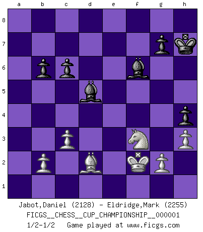 Last move : 1/2-1/2 2018 January 4 16:37:7 [Event "FICGS__CHESS__CUP_CHAMPIONSHIP__000001"] [Site "FICGS"] [Date "2017.09.28"] [Round "1"] [White "Jabot,Daniel"] [Black "Eldridge,Mark"] [Result "1/2-1/2"] [WhiteElo "2128"] [BlackElo "2255"] 1.e4 e5 2.Nf3 Nc6 3.Bb5 Nf6 4.O-O Nxe4 5.d4 Nd6 6.Bxc6 dxc6 7.dxe5 Nf5 8.Qxd8+ Kxd8 9.Nc3 Ke8 10.h3 Be7 11.Rd1 Nh4 12.Nxh4 Bxh4 13.Ne2 h5 14.Be3 Be7 15.Rd2 h4 16.Rad1 Rh5 17.f4 f6 18.a4 fxe5 19.fxe5 Rxe5 20.Bf4 Re4 21.Bxc7 Bf5 22.Nd4 Bg6 23.Nf3 Bf6 24.a5 Bh5 25.Kf2 Rc8 26.Bd6 b6 27.axb6 axb6 28.Rd3 Kf7 29.c3 Kg8 30.Re1 Rxe1 31.Nxe1 Bf7 32.Nf3 Rd8 33.Rd2 Kh7 34.Bf4 Rxd2+ 35.Bxd2 Bd5 1/2-1/2 Ruy Lopez : Berlin defense, Open variation Kingside Castling by player White (move 4) This chess game ended in a draw. Follow this game move after move (download)Daring ideas are like Chess men moved forward. They may be beaten, but they may start a winning game. (Johann Wolfgang von Goethe) Die westlichen Werte sind eine Sprache, welche die Putin-Administration nicht versteht. (Garry Kasparov) Tu puedes aprender mucho mas de una partida que pierdas que de una partida ganada. Tendras que perder cientos de partidas antes de llegar a ser un buen jugador. (Jose Raul Capablanca) Mais n'est-ce pas déjà le limiter injurieusement que d'appeler les échecs un jeu? N'est-ce pas aussi une science, un art, ou quelque chose qui, comme le cercueil de Mahomet entre ciel et terre, est suspendu entre l'un et l'autre, et qui réunit un nombre incroyable de contraires ? (Stefan Zweig) Treat your password like your toothbrush. Don't let anybody else use it, and get a new one every six months. (Clifford Stoll)