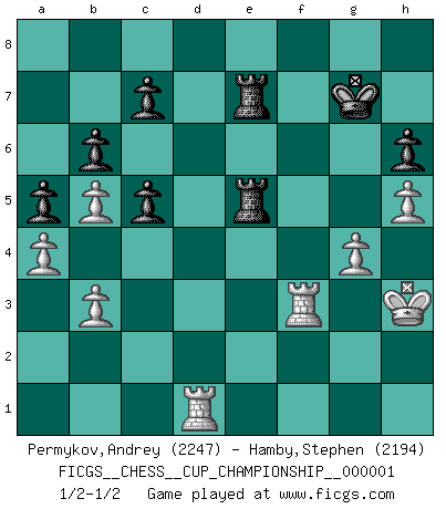 Last move : 1/2-1/2 2018 February 2 16:34:33 [Event "FICGS__CHESS__CUP_CHAMPIONSHIP__000001"] [Site "FICGS"] [Date "2017.09.28"] [Round "1"] [White "Permykov,Andrey"] [Black "Hamby,Stephen"] [Result "1/2-1/2"] [WhiteElo "2247"] [BlackElo "2194"] 1.d4 Nf6 2.c4 e6 3.Nf3 Bb4+ 4.Nbd2 O-O 5.a3 Bxd2+ 6.Bxd2 b6 7.Bg5 Bb7 8.e3 d6 9.Bd3 Nbd7 10.Bh4 e5 11.Bc2 exd4 12.Nxd4 Ne5 13.O-O Ng6 14.Bg3 Ne4 15.Bxe4 Bxe4 16.f3 Bb7 17.e4 a5 18.b3 Qg5 19.Qc1 Qf6 20.Nf5 Rae8 21.Qd2 Bc8 22.Nd4 Bd7 23.Nb5 Bxb5 24.cxb5 Re7 25.Rae1 Qe6 26.Qc3 Rfe8 27.Qc2 f6 28.Rd1 Qf7 29.a4 Nf8 30.Bf2 Ne6 31.Rfe1 h6 32.Qc4 g6 33.Qc3 Kg7 34.h4 Kh7 35.Kf1 Kg8 36.Be3 Kh7 37.Qc4 f5 38.Bf2 Qf6 39.exf5 Qxf5 40.Re4 Nc5 41.Rf4 Qe6 42.Bxc5 Qxc4+ 43.Rxc4 dxc5 44.Rc2 Kg7 45.Kf2 g5 46.h5 g4 47.Rc3 gxf3 48.Rxf3 Re2+ 49.Kg3 R8e7 50.Kh3 R2e5 51.g4 1/2-1/2 Bogo-Indian defense, Gruenfeld variation Kingside Castling by player Black (move 4) Kingside Castling by player White (move 13) This chess game ended in a draw. Follow this game move after move (download)Strategy requires thought, tactics require observation. (Max Euwe) Es liegt in der Natur, vernüftig zu denken und unlogisch zu handeln. (Anatole France) El Ajedrez, como cualquier actividad creativa, solo puede existir a través del esfuerzo combinado de aquellos que tienen talento creativo y de aquellos que poseen la habilidad de organizar su trabajo creativo. (Mikhail Botvinnik) Seul un grand joueur sait à quel point il joue faiblement. (Xavier Tartacover) I'll be back. (Arnold Schwarzenegger)
