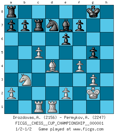 Last move : 1/2-1/2 2017 November 2 19:51:20 [Event "FICGS__CHESS__CUP_CHAMPIONSHIP__000001"] [Site "FICGS"] [Date "2017.09.28"] [Round "1"] [White "Drozdovas,Arturas"] [Black "Permykov,Andrey"] [Result "1/2-1/2"] [WhiteElo "2156"] [BlackElo "2247"] 1.d4 Nf6 2.c4 e6 3.g3 d5 4.Bg2 dxc4 5.Nf3 c5 6.O-O Nc6 7.dxc5 Qxd1 8.Rxd1 Bxc5 9.Nbd2 c3 10.bxc3 O-O 11.Nb3 Be7 12.c4 Bd7 13.Be3 Rfc8 14.Bf4 Be8 15.Rac1 h6 16.Nfd4 g5 17.Be3 Ng4 18.Nxc6 Bxc6 19.Bd4 Bxg2 20.Kxg2 Nf6 21.c5 Nd7 22.h4 Rc7 23.hxg5 hxg5 24.f4 1/2-1/2 Catalan : Open, 5.Nf3 Kingside Castling by player White (move 6) Kingside Castling by player Black (move 10) This chess game ended in a draw. Follow this game move after move (download)Chess is mental torture. (Garry Kasparov) Rubinstein ist ein Turmendspiel, welches die Götter vor tausenden von Jahren begannen. (Savielly Grigorievitsch Tartakower) Sin errores no puede haber brillantez. (Emanuel Lasker) Ce qui est bien, c'est d'avoir tout un tas de pièces en prise : l'adversaire ne peut en prendre qu'une à la fois. Cité par Thierry Audin. Mandala - that's it! 16x16 squares as multiple of the four and the eight because of the Four Noble Truths and the Noble Eightfold Path. (Heinz-Georg Lehnhoff about Big Chess)