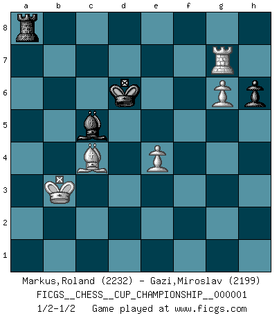 Last move : 1/2-1/2 2018 January 25 7:25:40 [Event "FICGS__CHESS__CUP_CHAMPIONSHIP__000001"] [Site "FICGS"] [Date "2017.09.28"] [Round "1"] [White "Markus,Roland"] [Black "Gazi,Miroslav"] [Result "1/2-1/2"] [WhiteElo "2232"] [BlackElo "2199"] 1.e4 c5 2.Nf3 d6 3.d4 cxd4 4.Nxd4 Nf6 5.Nc3 a6 6.Be3 e5 7.Nb3 Be6 8.Qd2 Be7 9.f3 O-O 10.O-O-O Nbd7 11.g4 b5 12.g5 b4 13.Ne2 Ne8 14.f4 a5 15.f5 a4 16.Nbd4 exd4 17.Nxd4 b3 18.Kb1 bxc2+ 19.Nxc2 Bb3 20.axb3 axb3 21.Na3 Ne5 22.h4 Ra4 23.Rh3 Qa8 24.Qd5 Rxa3 25.bxa3 Qxa3 26.Qd2 Nf6 27.Bd4 Nfd7 28.Rc3 Nc5 29.Rxc5 Nf3 30.Qa5 Qa2+ 31.Qxa2 bxa2+ 32.Kxa2 dxc5 33.Bf2 Ra8+ 34.Kb3 h6 35.g6 fxg6 36.fxg6 Bxh4 37.Bc4+ Kf8 38.Bxc5+ Be7 39.Rf1 Bxc5 40.Rxf3+ Ke7 41.Rf7+ Kd6 42.Rxg7 1/2-1/2 Sicilian : Najdorf, Byrne (English) attack Kingside Castling by player Black (move 9) Queenside Castling by player White (move 10) 10 pieces endgame at move 40 : White KRBPP , Black KRBPP WHITE : King + 1 Rook 1 Bishop 2 Pawns BLACK : King + 1 Rook 1 Bishop 2 Pawns 9 pieces endgame at move 42 : White KRBPP , Black KRBP WHITE : King + 1 Rook 1 Bishop 2 Pawns BLACK : King + 1 Rook 1 Bishop 1 Pawn This chess game ended in a draw. Follow this game move after move (download)Becoming successful at Chess allows you to discover your own personality. That's what I want for the kids I teach. (Saudin Robovic) Es hat in meinem Leben Zeiten gegeben, in denen das Schachspiel, wenn nicht zum Lebenszweck, so doch zu einem regelrechten Lebensersatz geworden ist. Man fühlt sich in solchen Zeiten nicht so, als besäße man eine göttliche Gabe, sondern eher so, als sei man von ihr besessen. (Garry Kasparov) El Ajedrez te enseña a controlarl la excitación inicial que sientes cuando vez algo que parece bueno y te enseña a pensar objetivamente cuando te encuentras en problemas. (Stanley Kubrick) Si rien de grave n'est détecté lors de l'analyse d'une position, on joue alors le coup. Seconde règle de Blumenfeld. Luck is when opportunity knocks and you answer. (Anonymous)