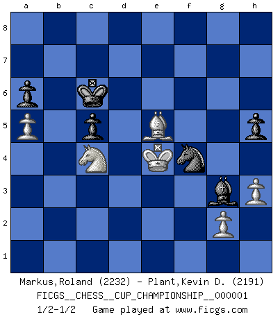 Last move : 1/2-1/2 2018 January 22 20:25:11 [Event "FICGS__CHESS__CUP_CHAMPIONSHIP__000001"] [Site "FICGS"] [Date "2017.09.28"] [Round "1"] [White "Markus,Roland"] [Black "Plant,Kevin D."] [Result "1/2-1/2"] [WhiteElo "2232"] [BlackElo "2191"] 1.e4 e5 2.Nf3 Nc6 3.Bb5 a6 4.Ba4 Nf6 5.d3 b5 6.Bb3 Be7 7.O-O d6 8.a4 Bd7 9.c3 O-O 10.Bc2 Re8 11.Re1 h6 12.Nbd2 Bf8 13.Nf1 d5 14.exd5 Nxd5 15.Ng3 b4 16.Bd2 Nf6 17.a5 Rb8 18.Bb3 bxc3 19.bxc3 Bg4 20.Bc4 Ra8 21.h3 Be6 22.Bxe6 Rxe6 23.d4 exd4 24.Rxe6 fxe6 25.Qa4 Qd5 26.cxd4 Bd6 27.Rb1 Rd8 28.Rc1 Ne7 29.Ne2 Rb8 30.Nc3 Qb3 31.Rb1 Qxa4 32.Rxb8+ Qe8 33.Rxe8+ Nxe8 34.Ne4 Nc6 35.Bc3 Nf6 36.Nxf6+ gxf6 37.Kf1 Nb4 38.Nd2 Nd5 39.Bb2 Kf7 40.Bc1 h5 41.Nb3 e5 42.dxe5 fxe5 43.Ke2 e4 44.f3 exf3+ 45.Kxf3 c5 46.Ke4 Nf6+ 47.Kd3 Nd7 48.Bg5 Ke6 49.Ke4 Bc7 50.Be3 Bd6 51.Nd2 Nf6+ 52.Kd3 Kd5 53.Nc4 Bg3 54.Bd2 Kc6 55.Bc3 Nd5 56.Be5 Nf4+ 57.Ke4 1/2-1/2 Ruy Lopez : Anderssen variation Kingside Castling by player White (move 7) Kingside Castling by player Black (move 9) This chess game ended in a draw. Follow this game move after move (download)Not all artists are Chess players, but all Chess players are artists. (Marcel Duchamp) Alles was ich jemals tun will ist Schach spielen. (Robert James Fischer) Te sientas frente a un tablero y repentinamente tu corazón brinca. Tu mano tiembla al tomar una pieza y moverla. Pero lo que el Ajedrez te enseña es que tu debes permanecer ahí con calma y pensar de que si realmente es una buena idea o de que si hay otras ideas mejores. (Stanley Kubrick) L'action d'une oeuvre littéraire se déroule sur un champ de bataille. Les masques et les types du drame moderne correspondent aux pièces du jeu d'échecs. L'intrigue correspond aux coups et aux gambits, c'est à dire aux techniques du jeu telles qu'utilisées et interprétées par les joueurs. Les tactiques et les péripéties [mouvements] correspondent aux coups exécutés par l'adversaire. (Viktor Shklovsky) A proverb is a short sentence based on long experience. (Miguel de Cervantes)