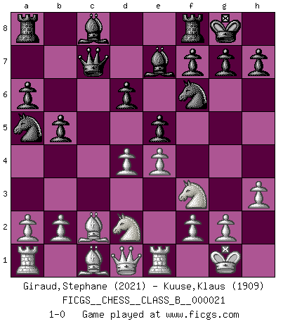 Last move : 1-0 2007 June 21 14:16:38 [Event "FICGS__CHESS__CLASS_B__000021"] [Site "FICGS"] [Date "2007.04.16"] [Round "1"] [White "Giraud,Stephane"] [Black "Kuuse,Klaus"] [Result "1-0"] [WhiteElo "2021"] [BlackElo "1909"] 1.e4 e5 2.Nf3 Nc6 3.Bb5 a6 4.Ba4 Nf6 5.O-O Be7 6.Re1 b5 7.Bb3 d6 8.h3 O-O 9.c3 Na5 10.Bc2 c5 11.d4 Qc7 12.Nbd2 cxd4 13.cxd4 1-0 Ruy Lopez : Closed Kingside Castling by player White (move 5) Kingside Castling by player Black (move 8) Player White won this chess game. Follow this game move after move (download)The boy (then a 12 year old boy named Anatoly Karpov) doesn't have a clue about Chess, and there's no future at all for him in this profession. (Mikhail Botvinnik) Ihnen, Herr Lasker, habe ich nur drei Worte zu sagen: Schach und matt. (Siegbert Tarrasch) El Ajedrez es el arte del análisis. (Mikhail Botvinnik) Votre prénom est 'Tactique', votre deuxième prénom est 'Tactique' et votre nom est 'Tactique'. (Ken Smith) Internet: Absolute communication, absolute isolation. (Paul Carvel)