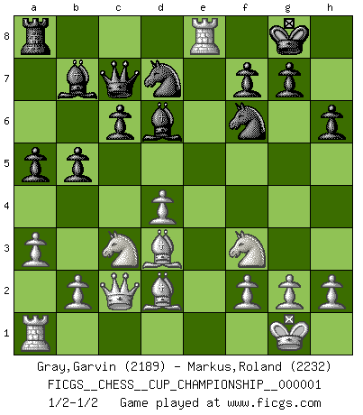 Last move : 1/2-1/2 2017 November 10 23:55:39 [Event "FICGS__CHESS__CUP_CHAMPIONSHIP__000001"] [Site "FICGS"] [Date "2017.09.28"] [Round "1"] [White "Gray,Garvin"] [Black "Markus,Roland"] [Result "1/2-1/2"] [WhiteElo "2189"] [BlackElo "2232"] 1.d4 Nf6 2.c4 c6 3.Nc3 d5 4.e3 e6 5.Nf3 Nbd7 6.Qc2 Bd6 7.Bd3 O-O 8.O-O dxc4 9.Bxc4 b5 10.Be2 Bb7 11.Rd1 Qc7 12.Bd2 Rfe8 13.a3 e5 14.Bd3 exd4 15.exd4 h6 16.Re1 a5 17.Rxe8+ 1/2-1/2 Queen's pawn game Kingside Castling by player Black (move 7) Kingside Castling by player White (move 8) This chess game ended in a draw. Follow this game move after move (download)Before the endgame, the Gods have placed the middle game. (Siegbert Tarrasch) Ich brauche nur einen Blick auf das Schachbrett zu werfen, und weiß schon, was in der Stellung steckt, was geschehen kann und was geschehen wird. Alle übrigen suchen und prüfen, ich aber weiß es! (José Raúl Capablanca) Yo adoro todas la posiciones. Denme una partida posicional difícil, y la jugaré. Pero posiciones totalmente ganadas, no las tolero. (Hein Donner) Vous n'êtes pas toujours obligé de jouer le meilleur coup. Un coup doit être actif, entreprenant, correct et beau ! (David Bronstein) Wawaweewa ! (Borat: Cultural learnings of America for make benefit glorious nation of Kazakhstan)