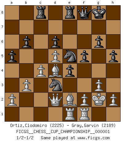 Last move : 1/2-1/2 2017 November 25 7:38:22 [Event "FICGS__CHESS__CUP_CHAMPIONSHIP__000001"] [Site "FICGS"] [Date "2017.09.28"] [Round "1"] [White "Ortiz,Clodomiro"] [Black "Gray,Garvin"] [Result "1/2-1/2"] [WhiteElo "2225"] [BlackElo "2189"] 1.Nf3 c5 2.e4 d6 3.d4 cxd4 4.Nxd4 Nf6 5.Nc3 a6 6.Be2 e5 7.Nb3 Be7 8.O-O Be6 9.Qd3 Nbd7 10.Nd5 O-O 11.Bd2 Bxd5 12.exd5 Rc8 13.c4 b6 14.Rae1 a5 15.Be3 Re8 16.g3 g6 17.Kg2 Bf8 18.Qd1 Bg7 19.Nd2 e4 20.Nb1 Nc5 21.Na3 Nfd7 22.Qd2 Ne5 23.b3 f5 24.Nb5 Qe7 25.Bf4 h5 26.Qe3 Nf7 27.Qd2 Be5 28.Be3 Bg7 29.Nd4 Bxd4 30.Bxd4 Ne5 31.Qh6 Qf8 32.Qd2 Ncd3 1/2-1/2 Reti Opening Kingside Castling by player White (move 8) Kingside Castling by player Black (move 10) This chess game ended in a draw. Follow this game move after move (download)I love all positions. Give me a difficult positional game, I will play it. But totally won positions, I cannot stand them. (Hein Donner) Der Umstand, daß uns eine 7 Stunden Zeitkontrolle ermöglicht eine großartige, tiefe Partie zu spielen, ist für die Massenmedien nicht weiter von Bedeutung. (Alexej Shirov) Prefiero perder una partida realmente buena, que ganar una mala. (David Levy) Dans le domaine de la peinture, de la gravure et de la sculpture, dès la première décennie de notre siècle, les artistes abandonnent la représentation de la partie d'échecs pour se concentrer sur les pièces, sur les échiquiers et sur toutes les variations auxquelles les unes et les autres peuvent donner lieu. On passe en quelque sorte d'un thème social à un thème musical (au sens de la musica médiévale, c'est-à-dire d'une notion qui inclue le rythme, l'harmonie, la construction et la déconstruction, etc.). Graphiquement et picturalement, l'échiquier apparaît comme une structure ouverte, dynamique, d'une richesse infinie, autorisant toutes les combinatoires et débouchant sur des mouvements et des rythmes de nature exponentielle. (Michel Pastoureau) There are two major products that came out of Berkeley: LSD and UNIX. We do not believe this is to be a coincidence. (Jeremy S. Anderson)