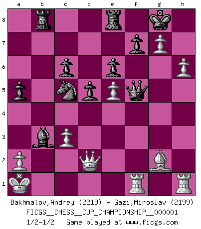 Last move : 1/2-1/2 2018 January 8 10:52:24 [Event "FICGS__CHESS__CUP_CHAMPIONSHIP__000001"] [Site "FICGS"] [Date "2017.09.28"] [Round "1"] [White "Bakhmatov,Andrey"] [Black "Gazi,Miroslav"] [Result "1/2-1/2"] [WhiteElo "2219"] [BlackElo "2199"] 1.e4 c5 2.Nf3 d6 3.d4 cxd4 4.Nxd4 Nf6 5.Nc3 a6 6.h3 e6 7.g4 h6 8.Bg2 Be7 9.Be3 Nc6 10.Nxc6 bxc6 11.Qd2 d5 12.O-O-O Rb8 13.Kb1 Nd7 14.b3 O-O 15.Na4 a5 16.f4 Ba6 17.h4 Bb5 18.g5 Bxa4 19.gxh6 Bb4 20.c3 Bd6 21.hxg7 Re8 22.h5 Bc5 23.Bxc5 Nxc5 24.h6 Qf6 25.e5 Qg6+ 26.f5 Qxf5+ 27.Ka1 Bxb3 28.Rdf1 1/2-1/2 Sicilian : Najdorf, Adams attack Queenside Castling by player White (move 12) Kingside Castling by player Black (move 14) This chess game ended in a draw. Follow this game move after move (download)The stomach is an essential part of the Chess master. (Bent Larsen) Deine Wertungszahl - vorausgesetzt einige Jahre schachliche Anstrengung - entspricht etwa dem zehnfachen Deines IQ plus 1000. (Jonathan Levitt) El Ajedrez es tan interesante por sí solo, que no es necesario un interés monetario para persuadir a una persona a que lo practique; por lo tanto, nunca se juega por dinero. (Benjamin Franklin) Il n'y a plus de joueurs du niveau de Jacob Murray dont la seule quête est le beau jeu, le plaisir de voir les pièces construire quelque chose. Sur 10 idées à la minute, 9 seront sans intérêt, la dernière s'avèrera géniale. (Christian Bauer) Waiting for chance ? Play in casinos. (FICGS proverb)