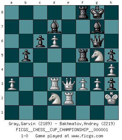 Last move : 1-0 2017 December 26 13:23:51 [Event "FICGS__CHESS__CUP_CHAMPIONSHIP__000001"] [Site "FICGS"] [Date "2017.09.28"] [Round "1"] [White "Gray,Garvin"] [Black "Bakhmatov,Andrey"] [Result "1-0"] [WhiteElo "2189"] [BlackElo "2219"] 1.d4 Nf6 2.c4 g6 3.Nc3 Bg7 4.e4 d6 5.h3 O-O 6.Nf3 e5 7.d5 Nh5 8.Nh2 Qe8 9.Be2 Nf4 10.Bf3 f5 11.Be3 a5 12.O-O Na6 13.a3 Nc5 14.Bxc5 dxc5 15.Qd2 Bd7 16.Rad1 Qf7 17.Rfe1 b6 18.h4 Rae8 19.g3 Nh3+ 20.Kg2 h5 21.d6 fxe4 22.Nxe4 c6 23.Qe3 Qxc4 24.Nf1 Qf7 25.Nfd2 a4 26.Re2 Kh7 27.Qc3 Qf5 28.Kh2 Rd8 29.Bg2 Kg8 30.Qc4+ Rf7 31.Nf1 b5 32.Qxc5 g5 33.Qc2 g4 34.Rd3 Qg6 35.Bxh3 gxh3 36.Nfd2 Rdf8 37.b3 axb3 38.Qxb3 Kh8 39.Qc3 Bh6 40.Qxe5+ Bg7 41.Qc5 Rf5 42.Qa7 R5f7 43.f3 Kg8 44.Qe3 Rf5 45.Ng5 1-0 King's Indian : Makagonov system (5.h3) Kingside Castling by player Black (move 5) Kingside Castling by player White (move 12) Player White won this chess game. Follow this game move after move (download)I thought the most common mistake [in chess] was the first one: Learning the game :P (Garvin Gray, FICGS forum) Weshalb minderdergeübte Spieler mit g2-g4 beginnen? Die betreffenden sind unschlüssig, ob sie nun rechts (h4) oder links (f4) beginnen sollen, und in ihrer Ratlosigkeit entschliessen sie sich nach guter Bürgerart dazu, den goldenen Mittelweg zu wählen. (Aaron Nimzowitsch) Yo he agregado estos principios a la ley: pongan los Caballos en acción antes de que los dos Alfiles sean desarrollados. (Emanuel Lasker) L'action d'une oeuvre littéraire se déroule sur un champ de bataille. Les masques et les types du drame moderne correspondent aux pièces du jeu d'échecs. L'intrigue correspond aux coups et aux gambits, c'est à dire aux techniques du jeu telles qu'utilisées et interprétées par les joueurs. Les tactiques et les péripéties [mouvements] correspondent aux coups exécutés par l'adversaire. (Viktor Shklovsky) There are three kinds of lies: lies, damned lies and statistics. (Mark Twain)