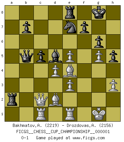 Last move : 0-1 2017 November 29 18:0:46 [Event "FICGS__CHESS__CUP_CHAMPIONSHIP__000001"] [Site "FICGS"] [Date "2017.09.28"] [Round "1"] [White "Bakhmatov,Andrey"] [Black "Drozdovas,Arturas"] [Result "0-1"] [WhiteElo "2219"] [BlackElo "2156"] 1.d4 d5 2.c4 e6 3.Nf3 Nf6 4.e3 Be7 5.cxd5 exd5 6.Bd3 a6 7.O-O O-O 8.Nc3 h6 9.b3 Re8 10.Bb2 Bd6 11.h3 Nc6 12.Rc1 Nb4 13.Bb1 Nc6 14.Na4 Rb8 15.Nc5 Ne7 16.Nh4 c6 17.Qf3 a5 18.Rfe1 Bc7 19.g4 a4 20.bxa4 Ra8 21.Bc2 h5 22.g5 Ne4 23.Nxe4 dxe4 24.Bxe4 Qd6 25.Qg2 Rxa4 26.Bb1 Be6 27.f4 g6 28.Nf3 Bxa2 29.Bc2 R4a8 30.Ne5 Qb4 31.Be4 Bxe5 32.Bc3 Qb5 33.fxe5 Bd5 34.Qc2 c5 35.Bd2 Ra2 0-1 Queen's gambit declined Kingside Castling by player White (move 7) Kingside Castling by player Black (move 7) Player Black won this chess game. Follow this game move after move (download)Many Chess players were surprised when after the game, Fischer quietly explained: 'I had already analyzed this possibility' in a position which I thought was not possible to foresee from the opening. (Mikhail Tal) Wie kann ich Remis annehmen? Ich weiß ja gar nicht, wie ich stehe! (Fritz Sämisch) No hay un Gran Maestro de Ajedrez que sea normal; solo se diferencían ellos por la magnitud de su locura. (Viktor Korchnoi) Le jeu d'échecs est comme rejeté hors du temps. (Antoine de Saint-Exupéry) Creativity is allowing yourself to make mistakes. Art is knowing which ones to keep. (Scott Adams)