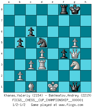 Last move : 1/2-1/2 2017 November 8 12:36:23 [Event "FICGS__CHESS__CUP_CHAMPIONSHIP__000001"] [Site "FICGS"] [Date "2017.09.28"] [Round "1"] [White "Khanas,Valeriy"] [Black "Bakhmatov,Andrey"] [Result "1/2-1/2"] [WhiteElo "2154"] [BlackElo "2219"] 1.e4 e5 2.Nf3 Nc6 3.Bb5 a6 4.Ba4 Nf6 5.O-O Be7 6.Re1 b5 7.Bb3 O-O 8.c3 d5 9.exd5 Nxd5 10.Nxe5 Nxe5 11.Rxe5 c6 12.d4 Bd6 13.Re1 Qh4 14.g3 Qh3 15.Be3 Bg4 16.Qd3 Rae8 17.Nd2 Qh5 18.a4 Re6 19.axb5 axb5 20.Nf1 Bf5 21.Qd2 Bh3 22.Bd1 Qg6 23.Bf3 Qf5 24.Qe2 Rfe8 25.Bg2 Bxg2 26.Kxg2 Rf6 27.Qd2 Rf8 28.Rad1 Rg6 29.Qe2 Qd7 30.Kh1 Qh3 31.Bc1 f5 32.f4 h5 33.Qf3 h4 34.Kg1 hxg3 35.hxg3 Qh6 36.Kf2 Rg4 37.Re2 g5 38.fxg5 Qh5 39.Ke1 Bxg3+ 40.Nxg3 Qh4 41.Rd3 f4 42.Rh2 Qxh2 43.Qxg4 Qg1+ 1/2-1/2 Ruy Lopez : Closed, 7...O-O Kingside Castling by player White (move 5) Kingside Castling by player Black (move 7) This chess game ended in a draw. Follow this game move after move (download)When the Chess game is over, the Pawn and the King go back to the same box. (Irish saying) Sie bekommen vielleicht den Eindruck, dass die Spitzenspieler überhaupt gar nicht so stark sind. Aber das stimmt nicht. Es ist eine Illusion. Mit einem Computer an der Seite ist es sehr leicht, Urteile zu fällen, aber wenn man alleine am Brett sitzt, sieht die Sache ganz anders aus. (Vladimir Kramnik) Puntos débiles o agujeros en la posición de tu oponente deben de ser ocupados por piezas, no Peones. (Siegbert Tarrasch) On peut tirer plus d'utilité d'une partie perdue que de 100 parties gagnées. (Capablanca) I don't diet. I just don't eat as much as I'd like to. (Linda Evangelista, supermodel)