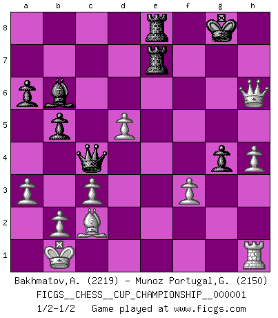 Last move : 1/2-1/2 2017 December 24 6:4:56 [Event "FICGS__CHESS__CUP_CHAMPIONSHIP__000001"] [Site "FICGS"] [Date "2017.09.28"] [Round "1"] [White "Bakhmatov,Andrey"] [Black "Munoz Portugal,Guillermo"] [Result "1/2-1/2"] [WhiteElo "2219"] [BlackElo "2150"] 1.e4 c5 2.Nf3 d6 3.d4 cxd4 4.Nxd4 Nf6 5.Nc3 a6 6.Be3 e5 7.Nb3 Be6 8.h3 Nc6 9.Qf3 Rc8 10.O-O-O Na5 11.Bg5 Be7 12.Bxf6 Bxf6 13.Nd5 b5 14.Nxa5 Qxa5 15.Kb1 Bd8 16.Bd3 g6 17.Qe2 Kf8 18.c3 Bxd5 19.exd5 Rc7 20.a3 Kg7 21.h4 h5 22.Rdg1 Qa4 23.g4 e4 24.Bxe4 Re7 25.f3 Bb6 26.Rg3 hxg4 27.Rxg4 f5 28.Qh2 fxg4 29.Bc2 Qc4 30.Qxd6 Rh8e8 31.Qxg6+ Kf8 32.Qh6+ Kg8 1/2-1/2 Sicilian : Najdorf, Byrne (English) attack Queenside Castling by player White (move 10) This chess game ended in a draw. Follow this game move after move (download)A man that will take back a move at Chess will pick a pocket. (Richard Fenton) Wenn ich Weiß habe gewinne ich weil ich Weiß habe, wenn ich Schwarz habe gewinne ich weil ich Bogoljubov bin. (Efim Bogoljubov) El Ajedrez es de 30 a 40 por ciento psicología. Uno no cuenta con esto cuando se juega contra una computadora. No lo puedo confundir. (Judith Polgar) Que feriez-vous si vous étiez en train de jouer aux échecs et que la fin du monde arrive ? Je continuerais à jouer. (Saint Borromée) Think like a man of action, act like a man of thought. (Henri Louis Bergson)